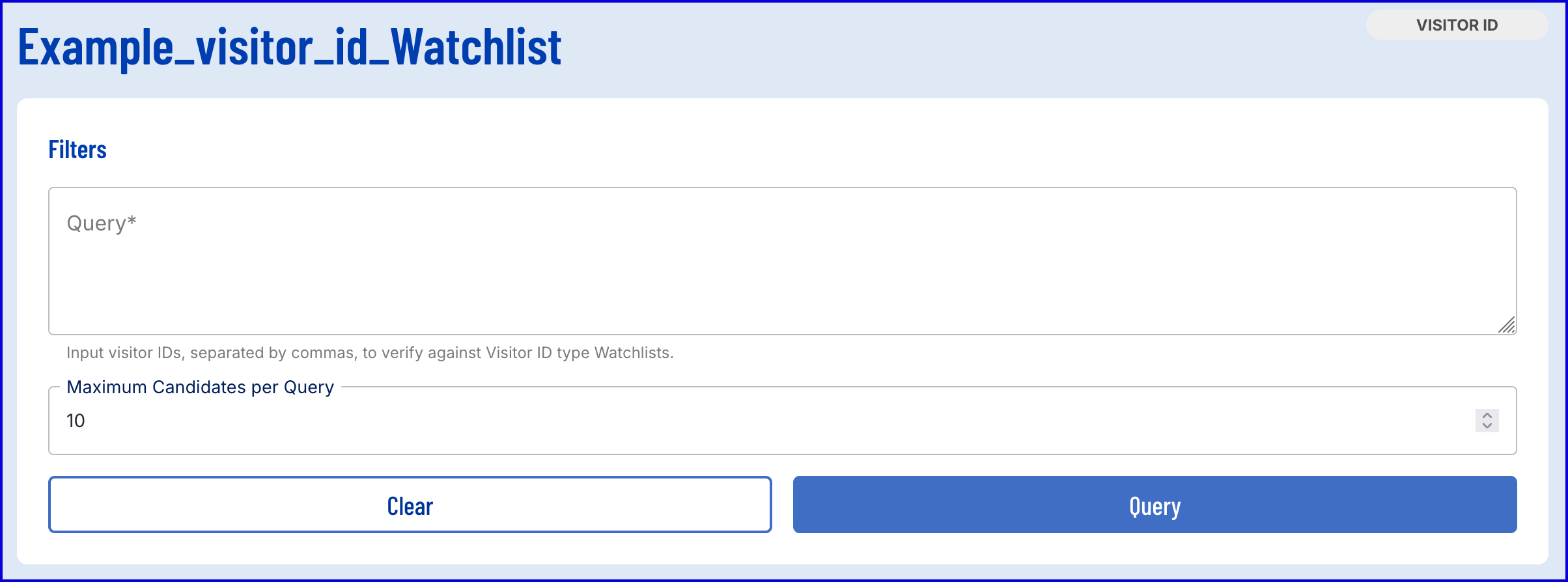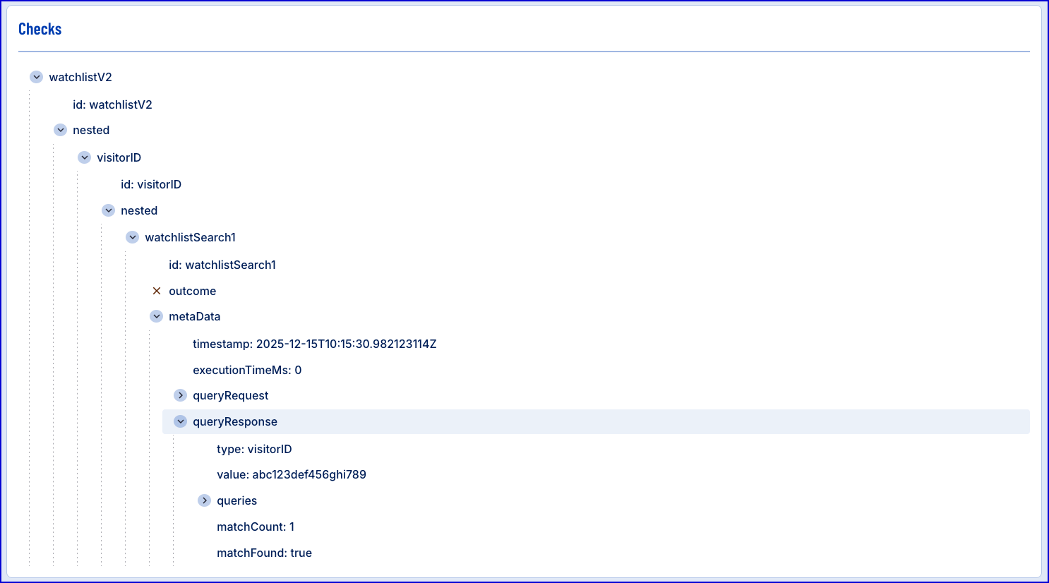 POST https://{{tenant}}.{{region}}.trustx.com/api/watchlist-manager/watchlists/{watchlistId}/queriesContent-Type: application/jsonAuthorization: Bearer {{token}}{ "type": "visitorID", "value": "abc123def456ghi789", "maxMatchResults": 10}Example Response: