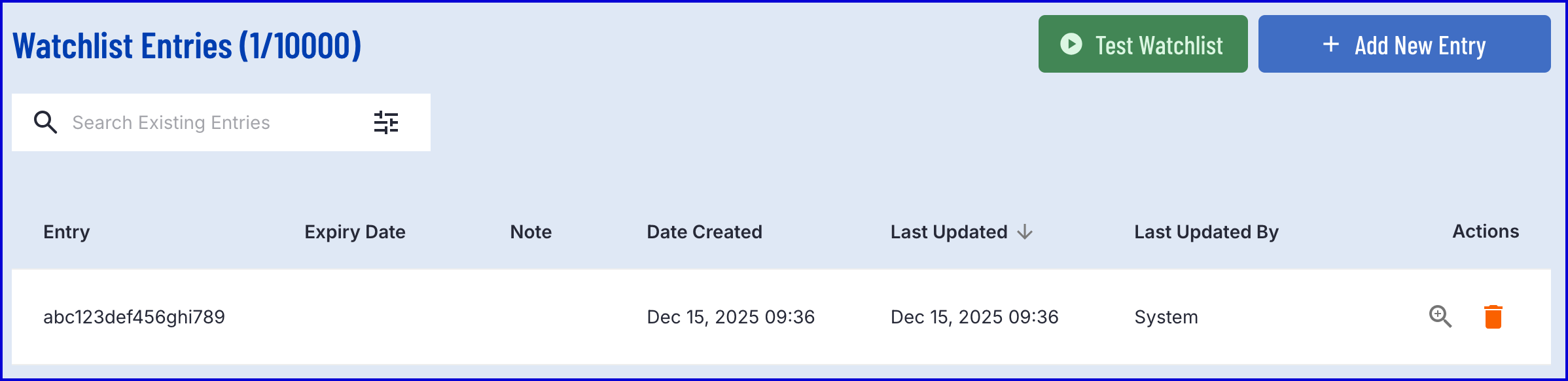 - Click the 'Manage Entries' button to open a list of entries currently within the Watchlist.