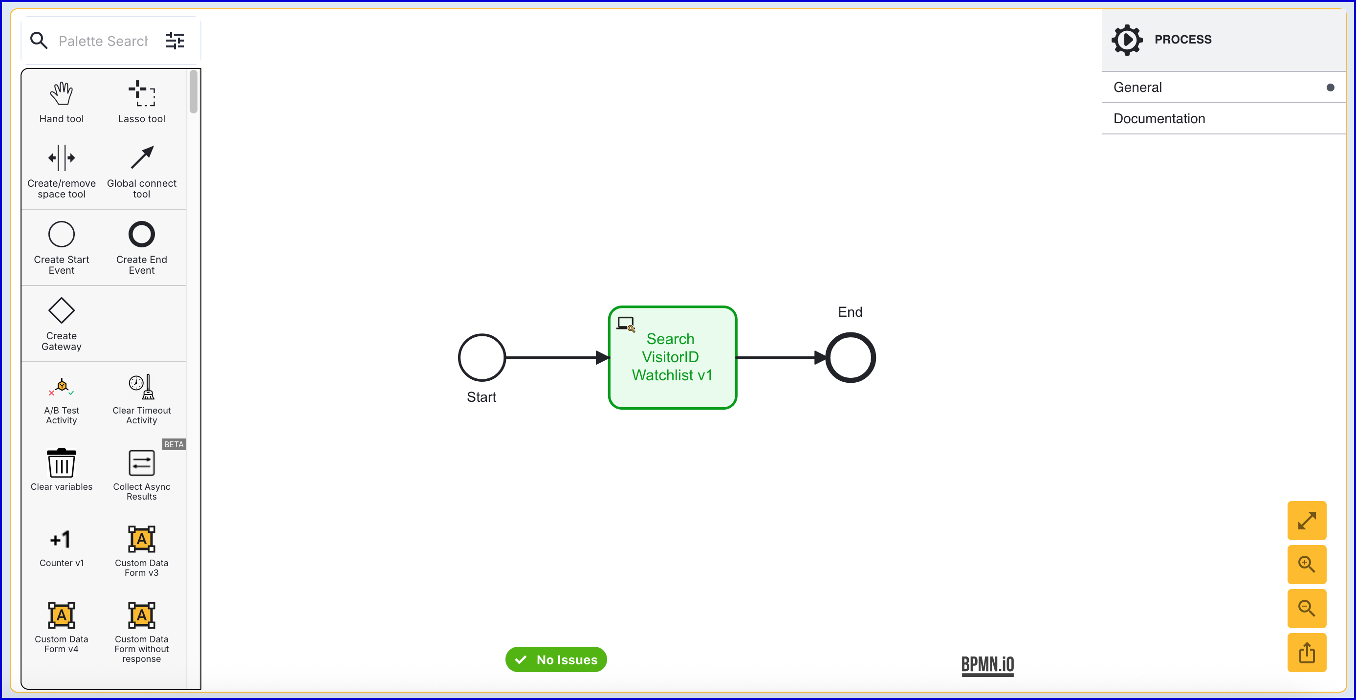 - Add a 'Search Visitor ID Watchlist v1' activity to the Process Designer and connect it to the 'Start' event using the 'Global connect tool'.