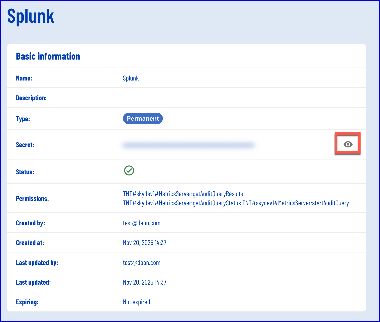 TRUSTX_API_KEY=<paste your TrustX API key secret here>TRUSTX_TENANT_HOST=<your_tenant>.oak.trustx.comSPLUNK_URL=https://http-inputs-<your_tenant>.splunkcloud.com:443/services/collectorSPLUNK_HEC_TOKEN=<paste your Splunk HEC token here>- To find your TrustX API key secret, navigate to the API Keys page in the TrustX Backoffice.