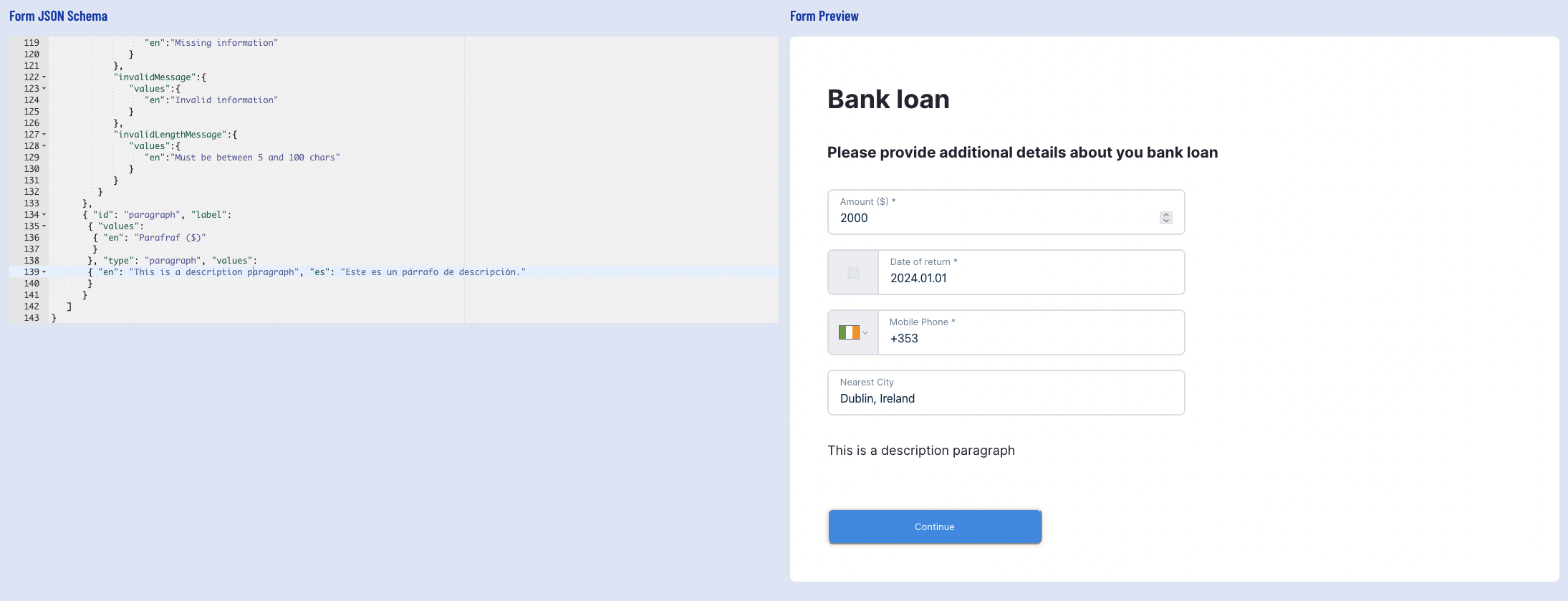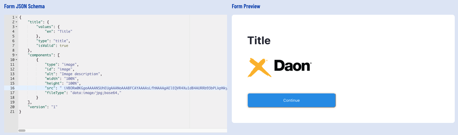 - Form JSON Schema - Used to define the fields and items that will be displayed to the user in the ID&V flow. For more information, see the Defining the JSON Schema section.