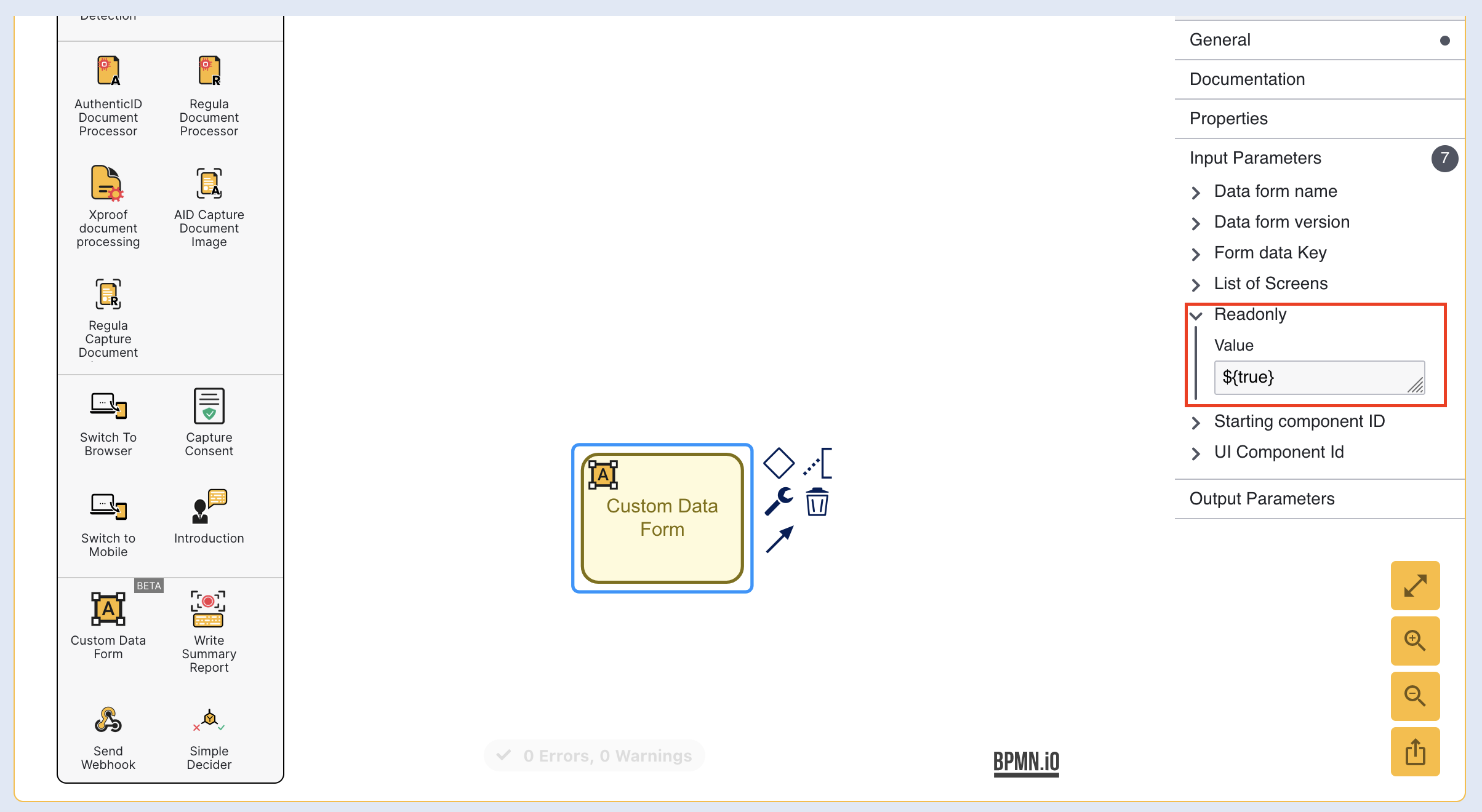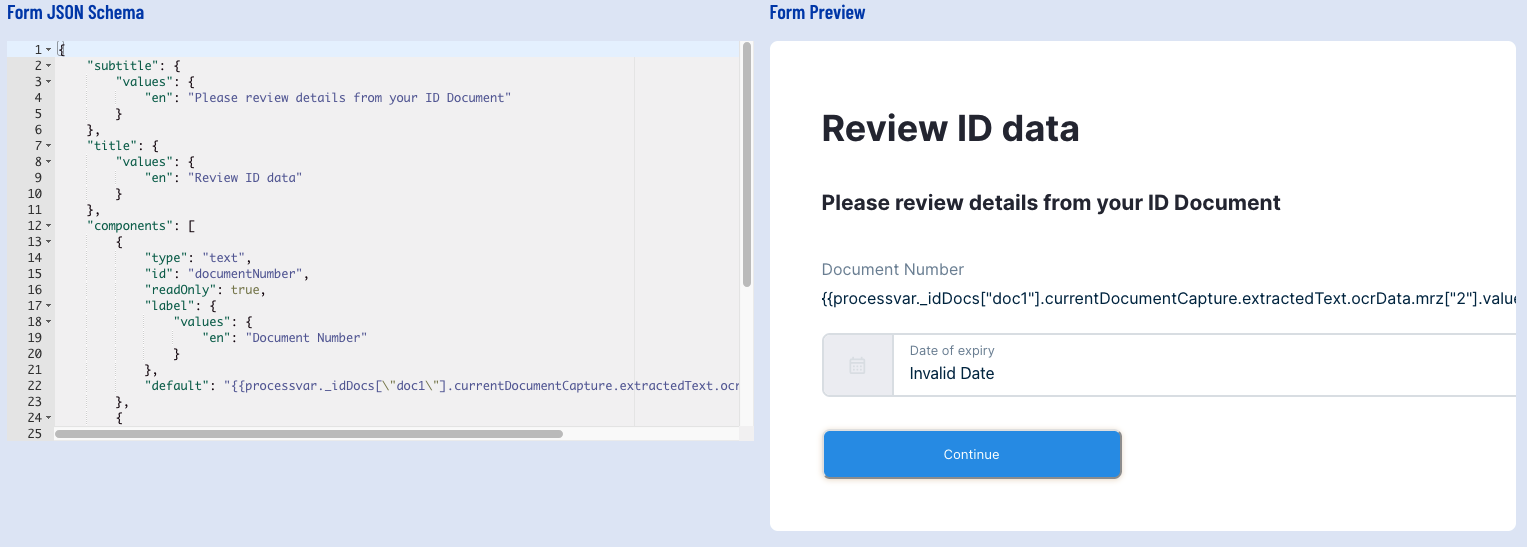 When configuring the form, it is recommended to use readOnly fields to ensure that OCR data inserted into the form is not modified by the end user during the ID&V process. This can be accomplished by making the individual component 'readOnly' or setting the whole form to 'readonly' in the Process Designer.