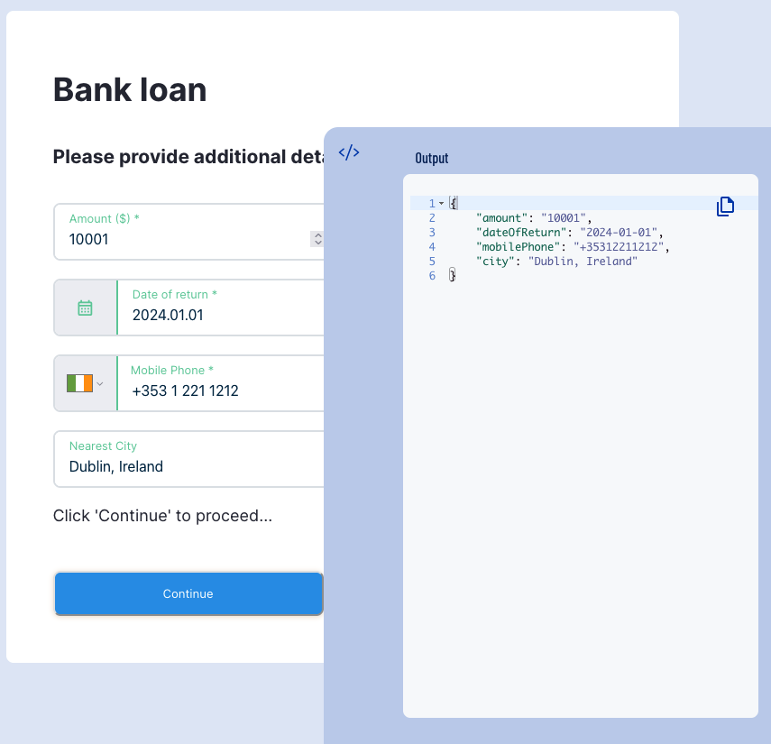 defaultCountry | String | For phone fields only. The default country code of the phone number to provide. Country codes must be presented as an ISO 3166 country code. For example: "ie". If left blank, this field will not show a country flag by default. |
