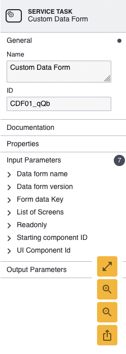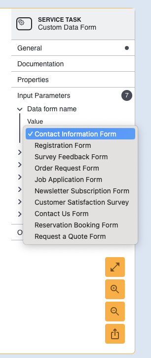 The specific form to display can be defined by expanding the Input Parameters field found in the right-most context menu when the Custom Data Form action is selected. First, click the Custom Data Form action so that it is highlighted blue. Then, expand the Input Parameters field