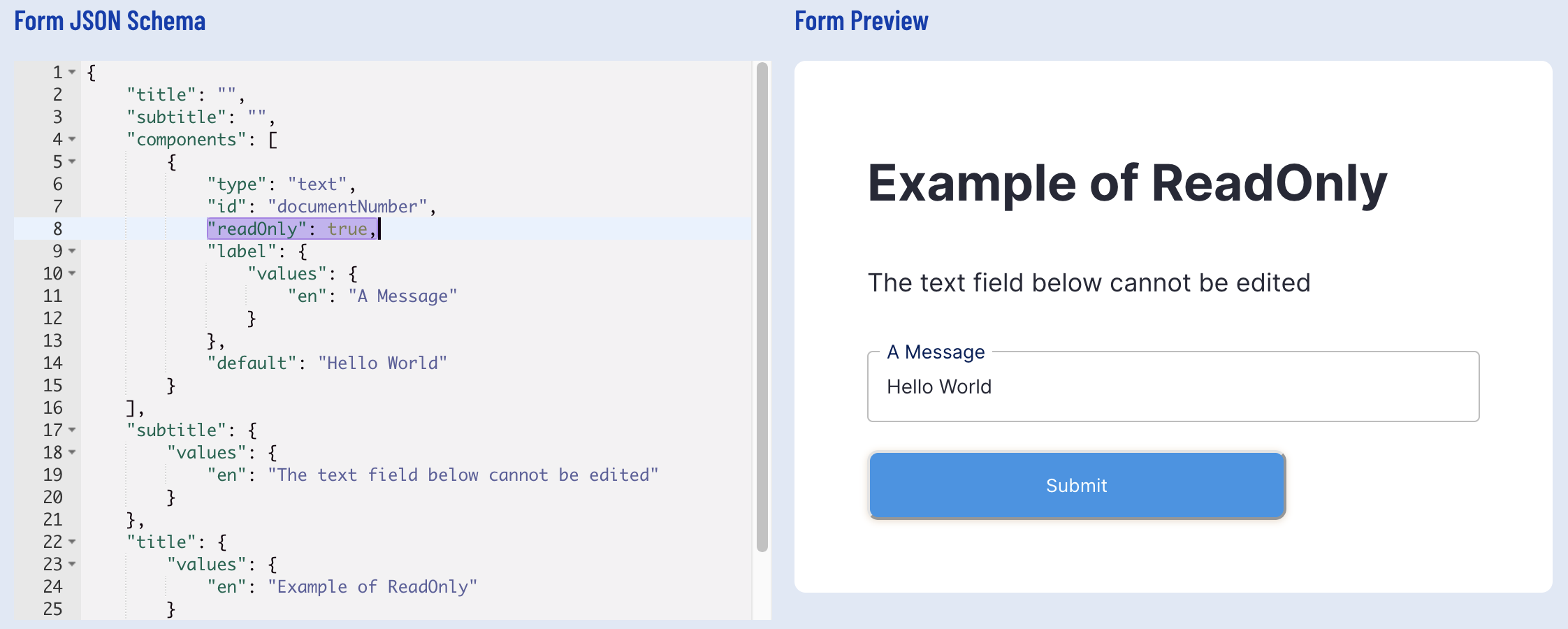 Individual fields of a form can be configured to 'readOnly' when defining the JSON in the Custom Form editor. This method allows for complete control over form fields and allows certain fields to be 'readOnly' while others remain editable to the end user.