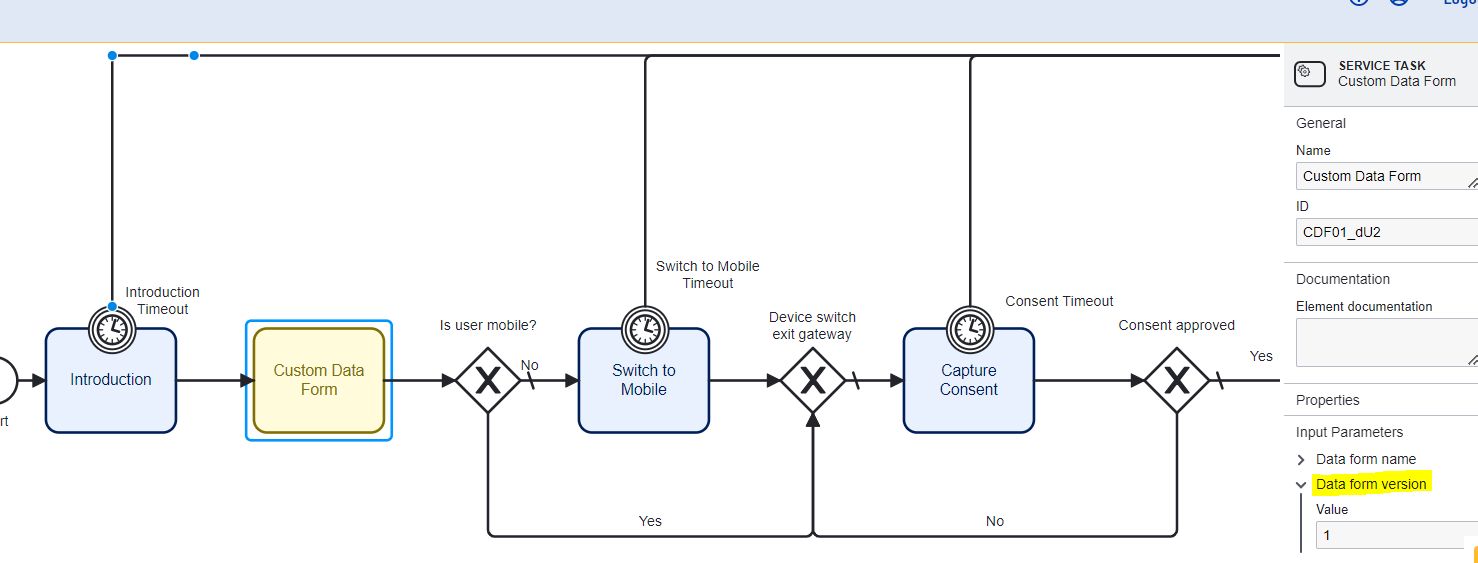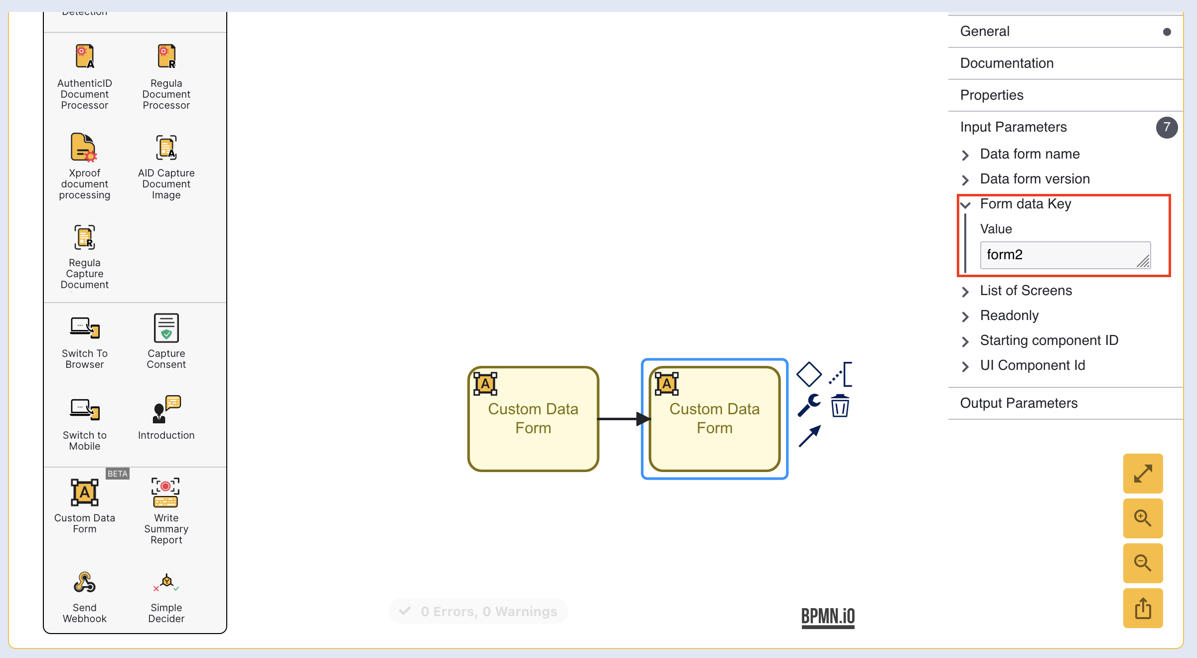 When using multiple Custom Data Form activities in a single Process Definition, the Form data key input parameter is used to identify each of the form activities.