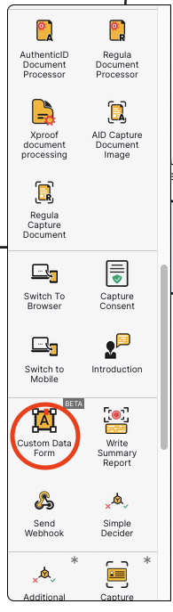 Custom Data Forms allow users to create a form with custom fields that can be introduced to the ID&V flow using the Process Designer. Custom Data Forms can be found in the Backoffice by selecting the menu option from the left-side vertical navigation bar.