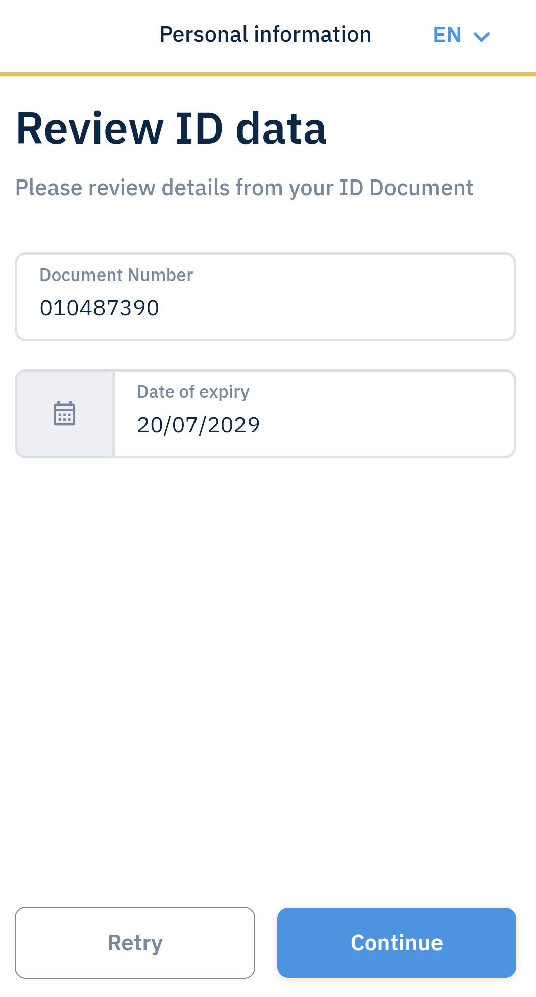 In the above example, a form is shown in mobile browser where the Document Number and Date of Expiry fields are populated with OCR Data.