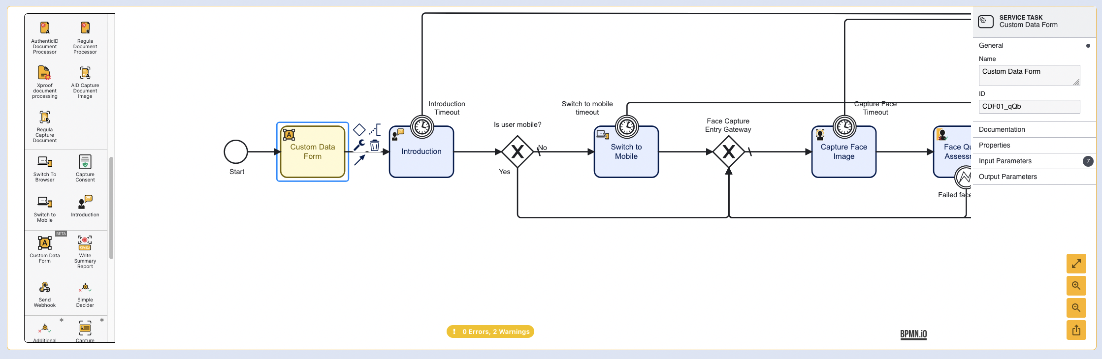 In the example above, the first Custom Data Form activity has a form data key of 'form1' while the highlighted form has a form data key value of 'form2'. This ensures that both forms can be uniquely identified from one another when data is retrieved during the ID&V flow.