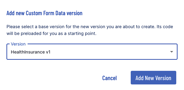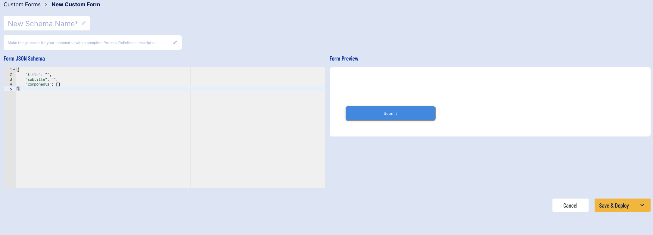 Selecting this button will open the Custom Form creation page where fields of the form can be defined using JSON schema.