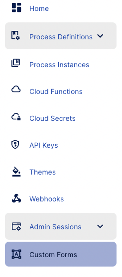 This will open the Process Definitions page. A Custom Form can be added to an existing or newly created Process Definition. In this example, a new Process Definition will be created. From the Process Editor, the Custom Data Form action can be used to add a new Custom Form to the flow.