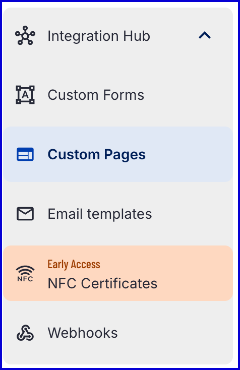 A new Custom Page can be created from the Backoffice application. Access the Backoffice and find the 'Custom Pages' page located in the 'Integration Hub' menu in the left-side navigation bar.