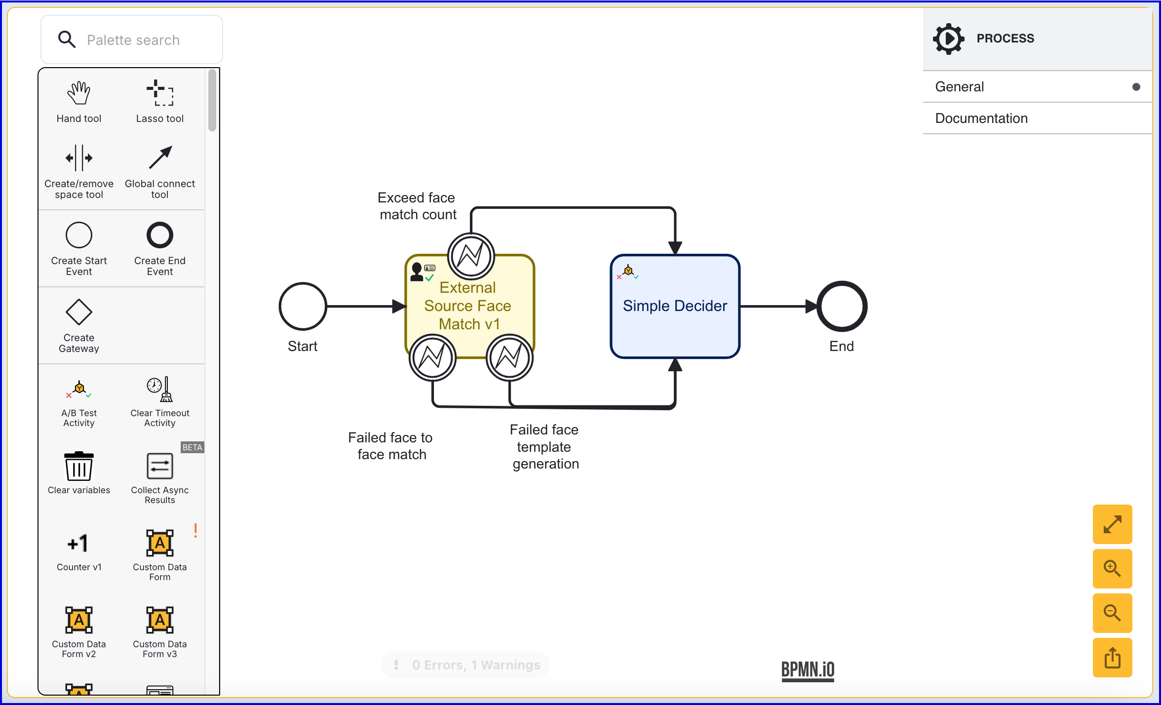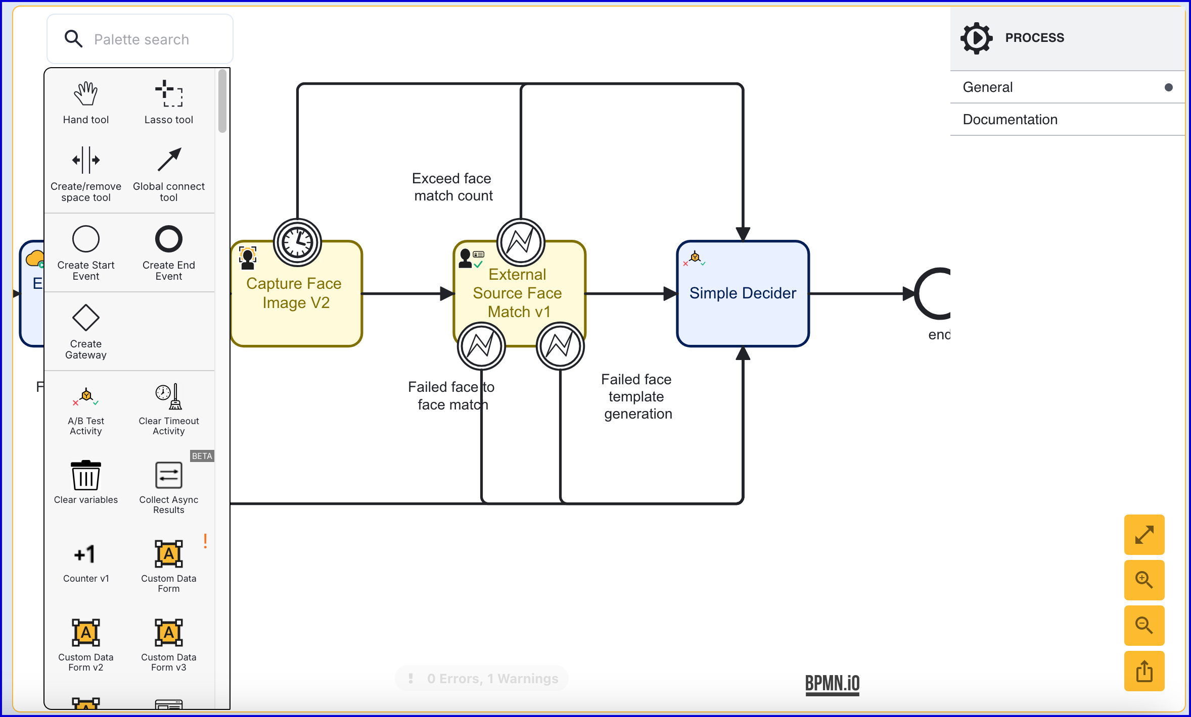 - Add a 'Simple Decider' activity and connect to the 'External Source Face Match v1' activity using a sequence flow arrow. This will generate a final decision for the Process Instance based on the result of the external source face match.