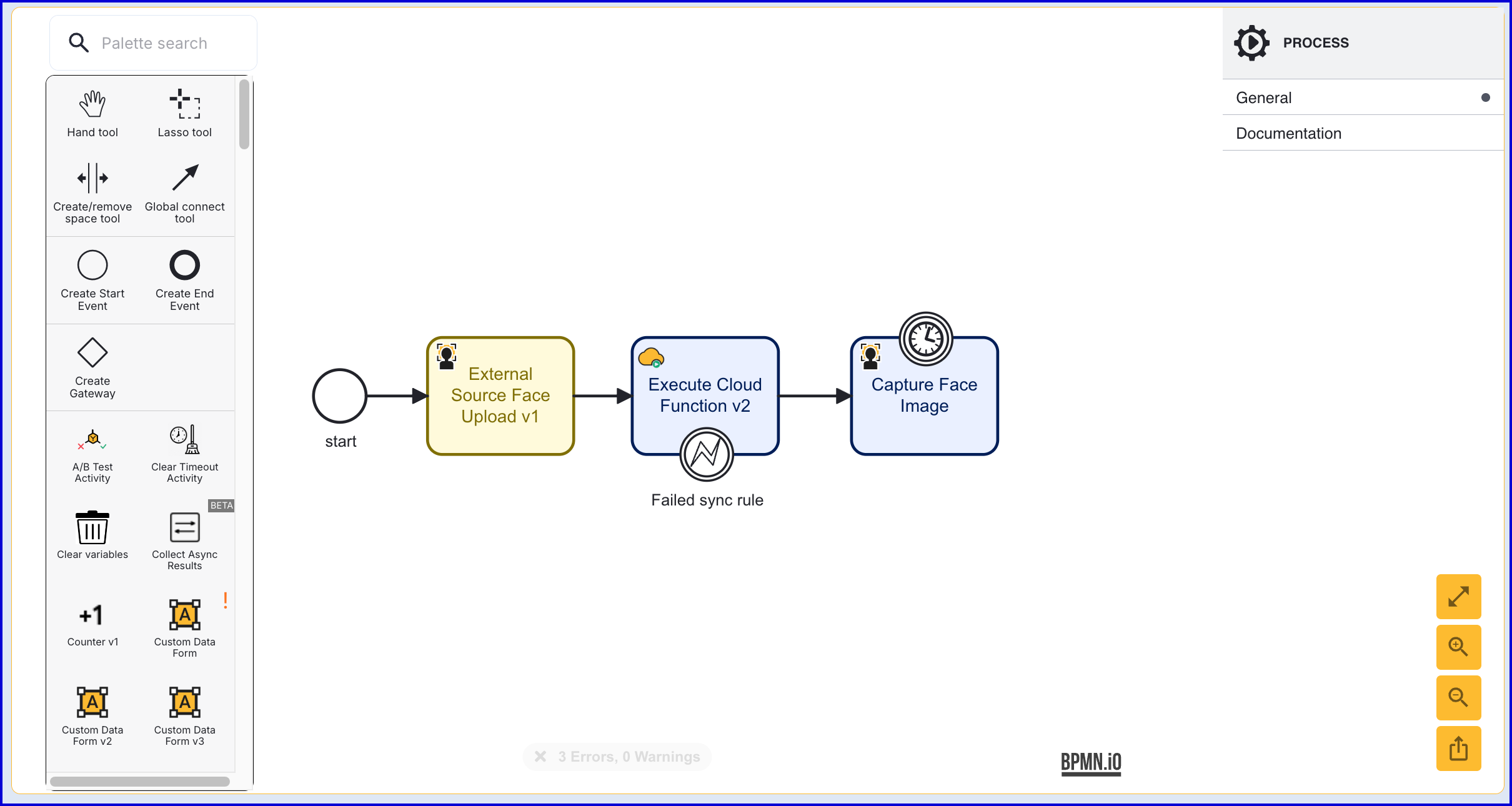 - Add a 'Capture Face Image' activity to the Process Designer and connect the activity to the 'Execute Cloud Function v2' activity using a sequence flow arrow.