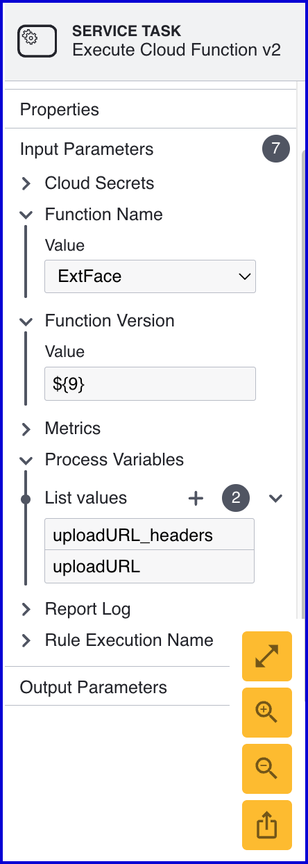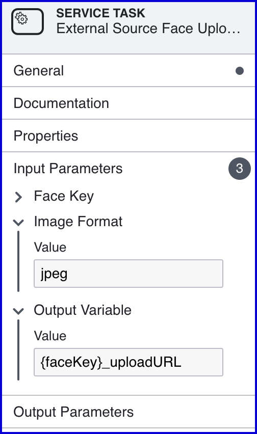 - Click the 'External Source Face Upload v1' activity to open the right-most contextual menu and expand the Input Parameters to see the available 'Output Variable'.