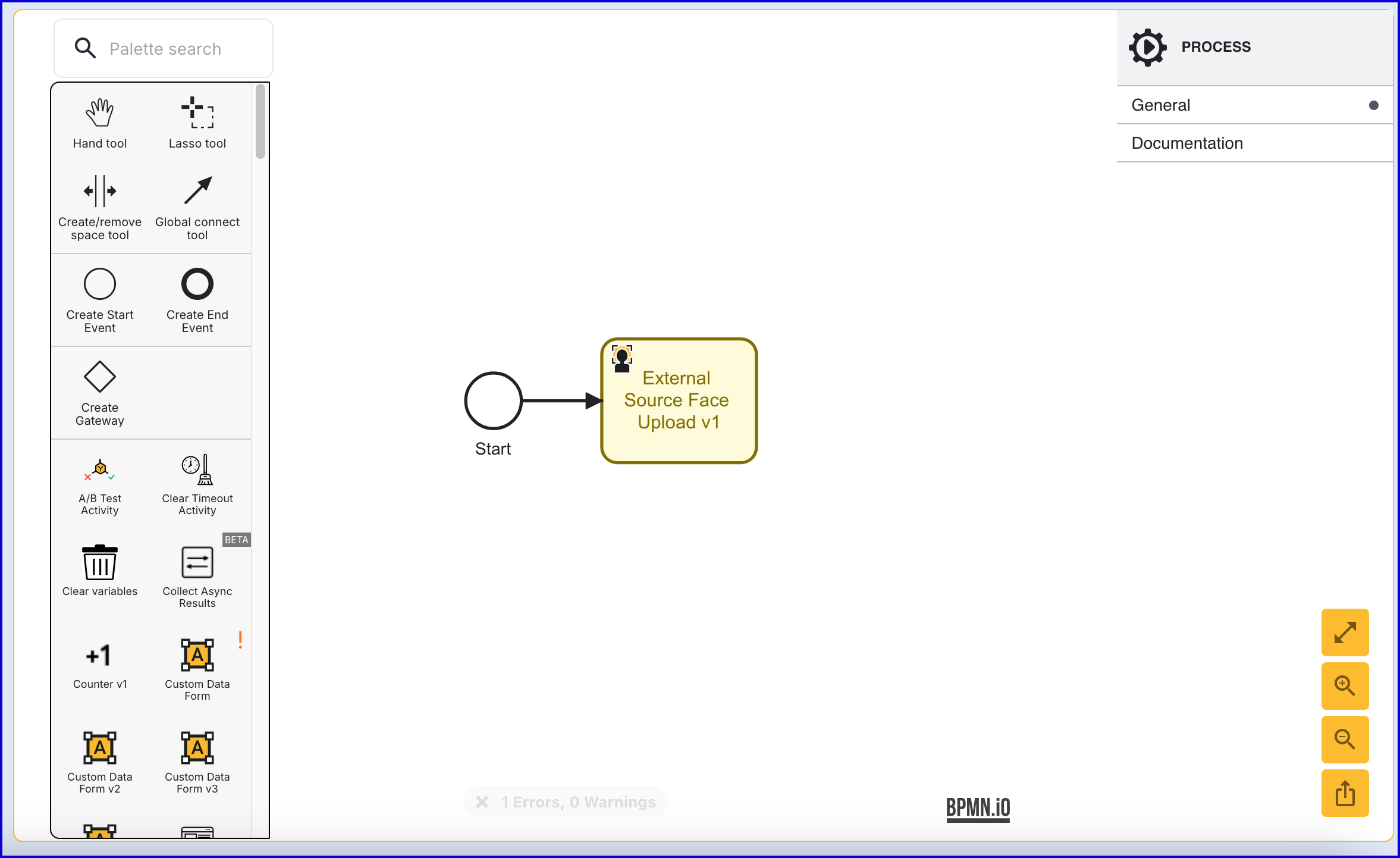 - From the 'Start' activity, add an 'External Source Face Match v1' activity and connect them using a sequence flow arrow.