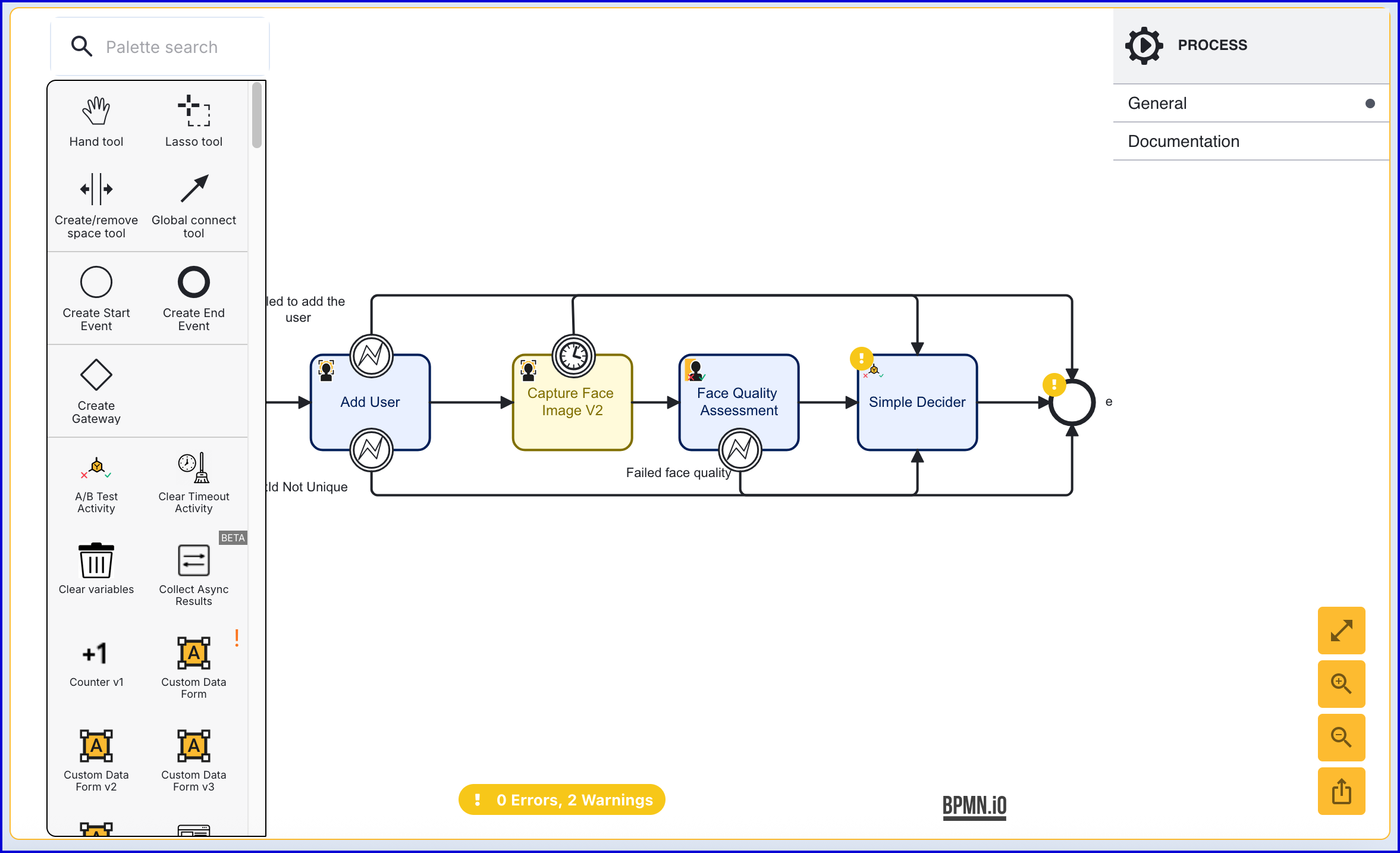 The 'Add User' activity includes two error events. In this example, the error events have been connected to the 'End' event.