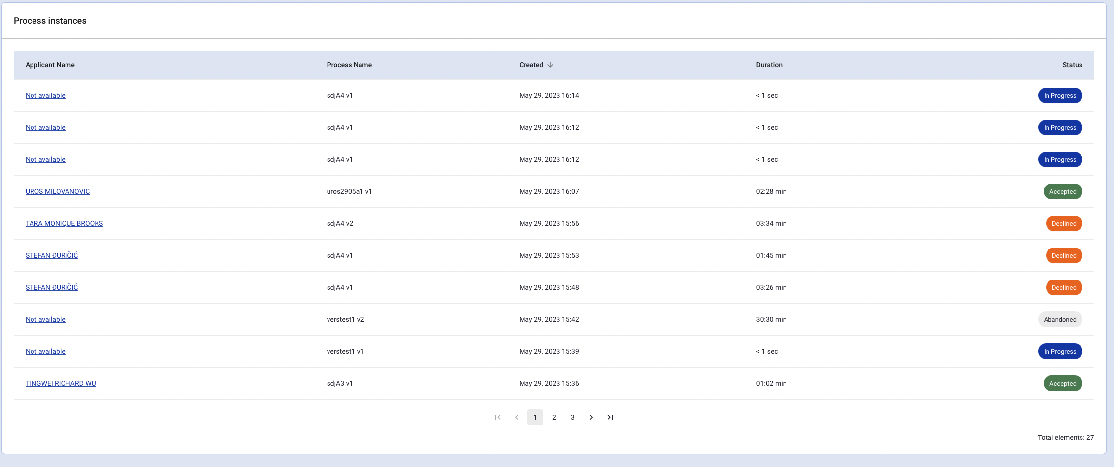 Feedback from the Identity Verification flow can reviewed in the Back Office web app by navigating to the Process Instances page. Click the link found on the left-side vertical menu to find a list of Process Instances and their most recent status. For more details on exploring Process Instance information, see the Process Instances Guide.