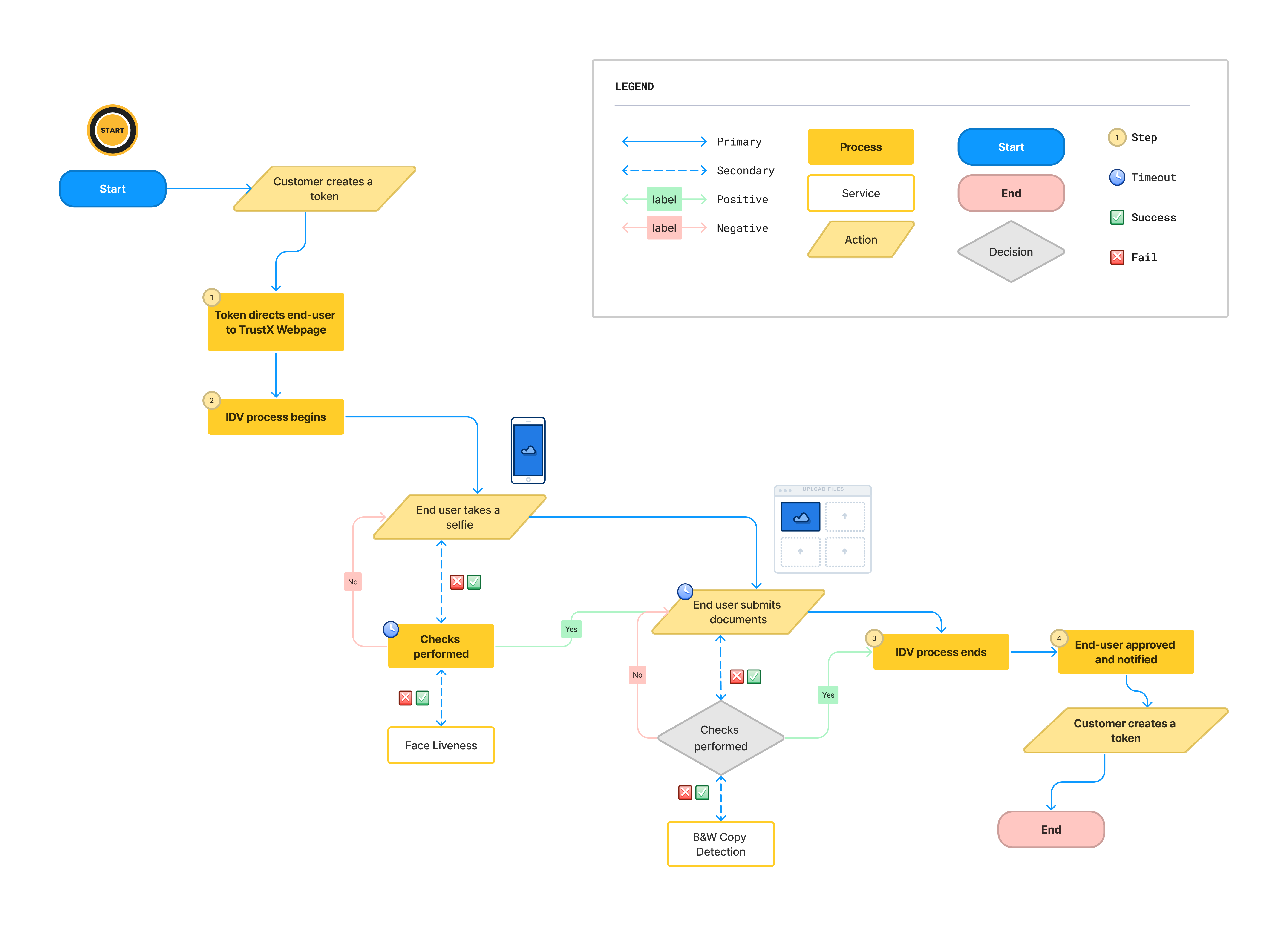 This guide will describe the steps required to get up and running with TrustX for a full Identity Verification experience. The diagram below illustrates the integration process.