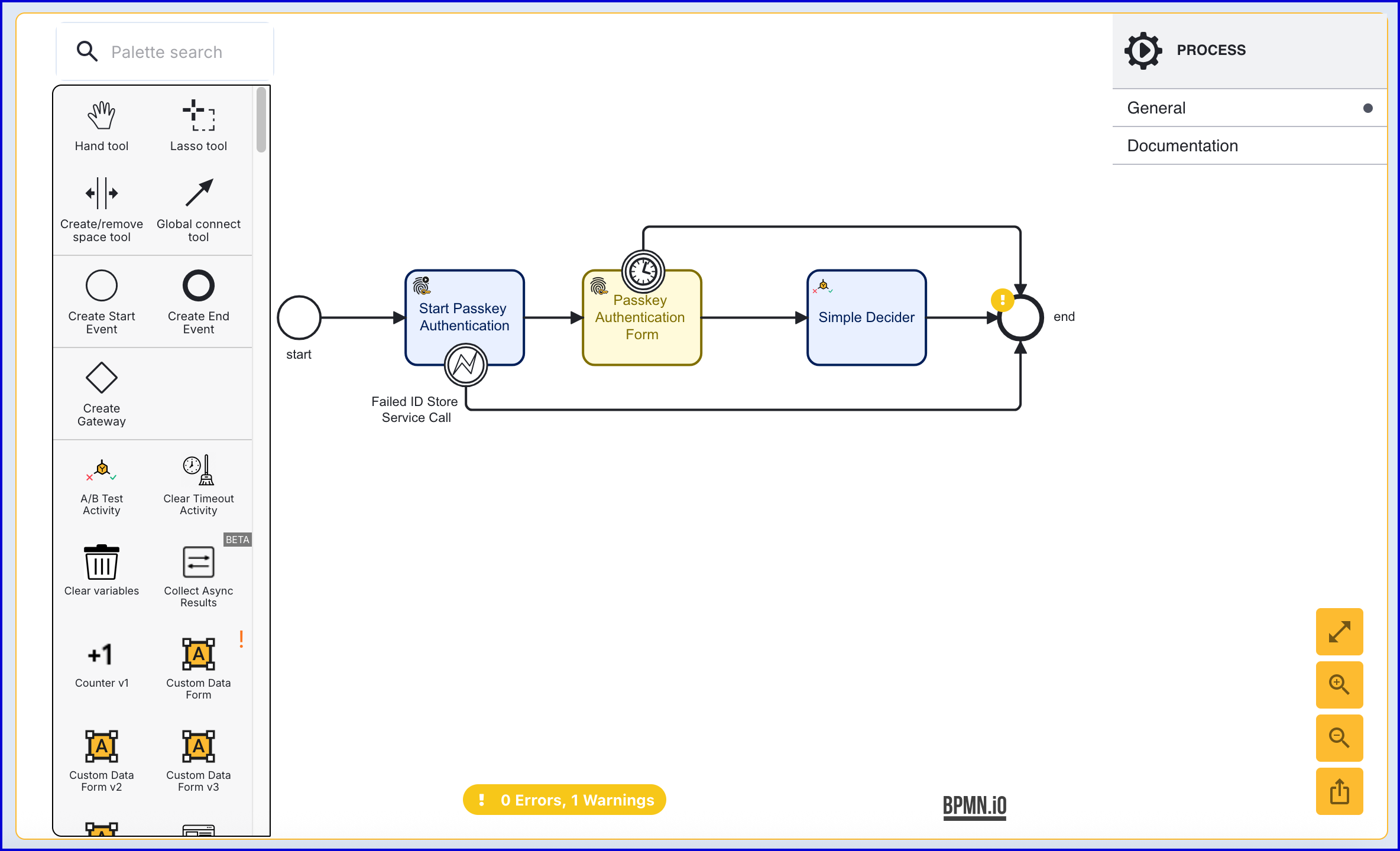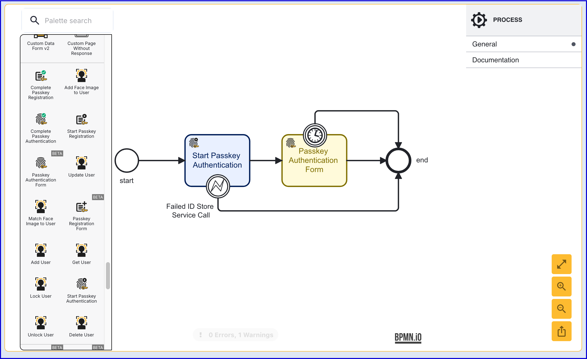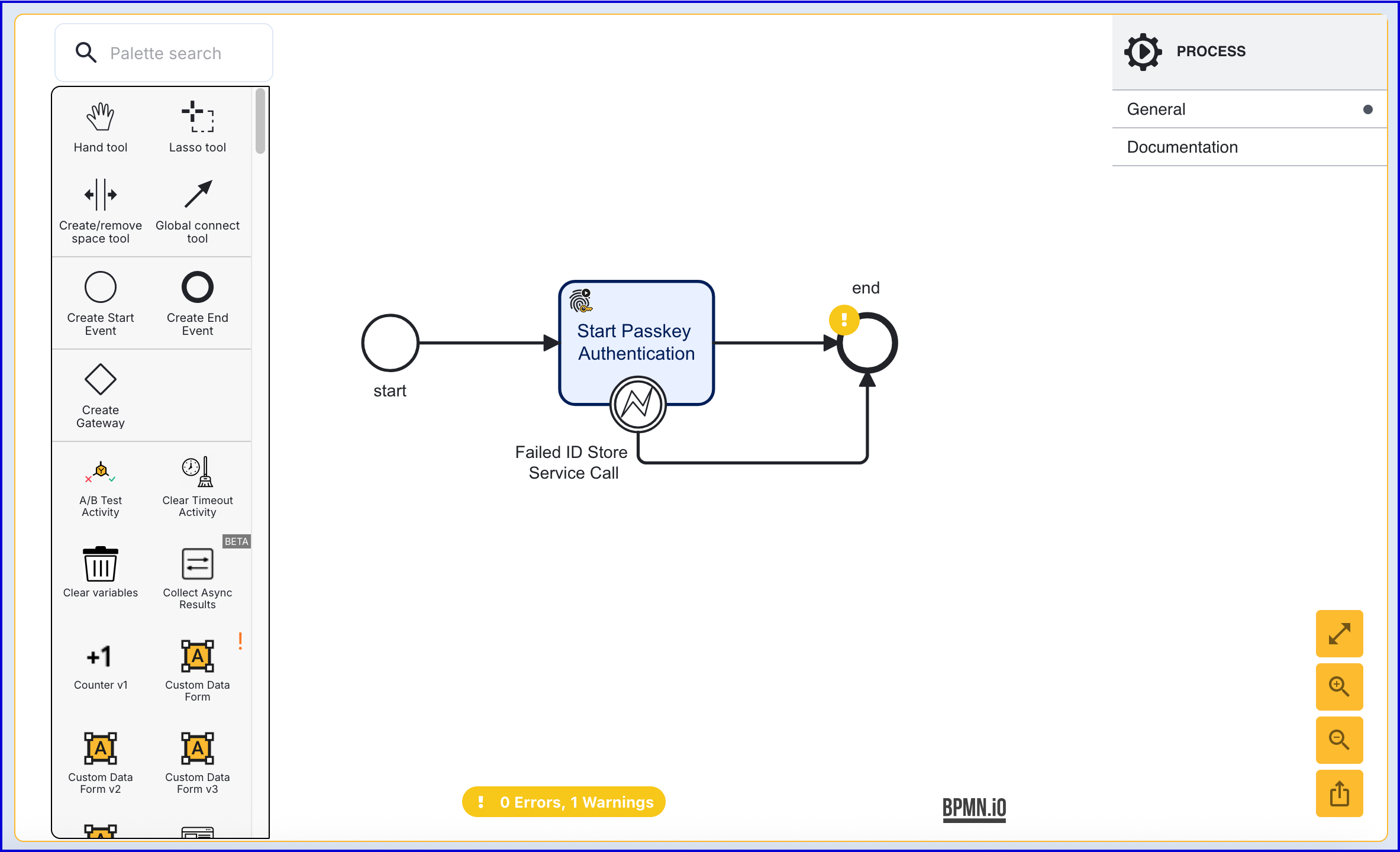 - In the Process Designer, add the 'Start Passkey Authentication' activity after the 'start' event and connect using a sequence flow arrow.