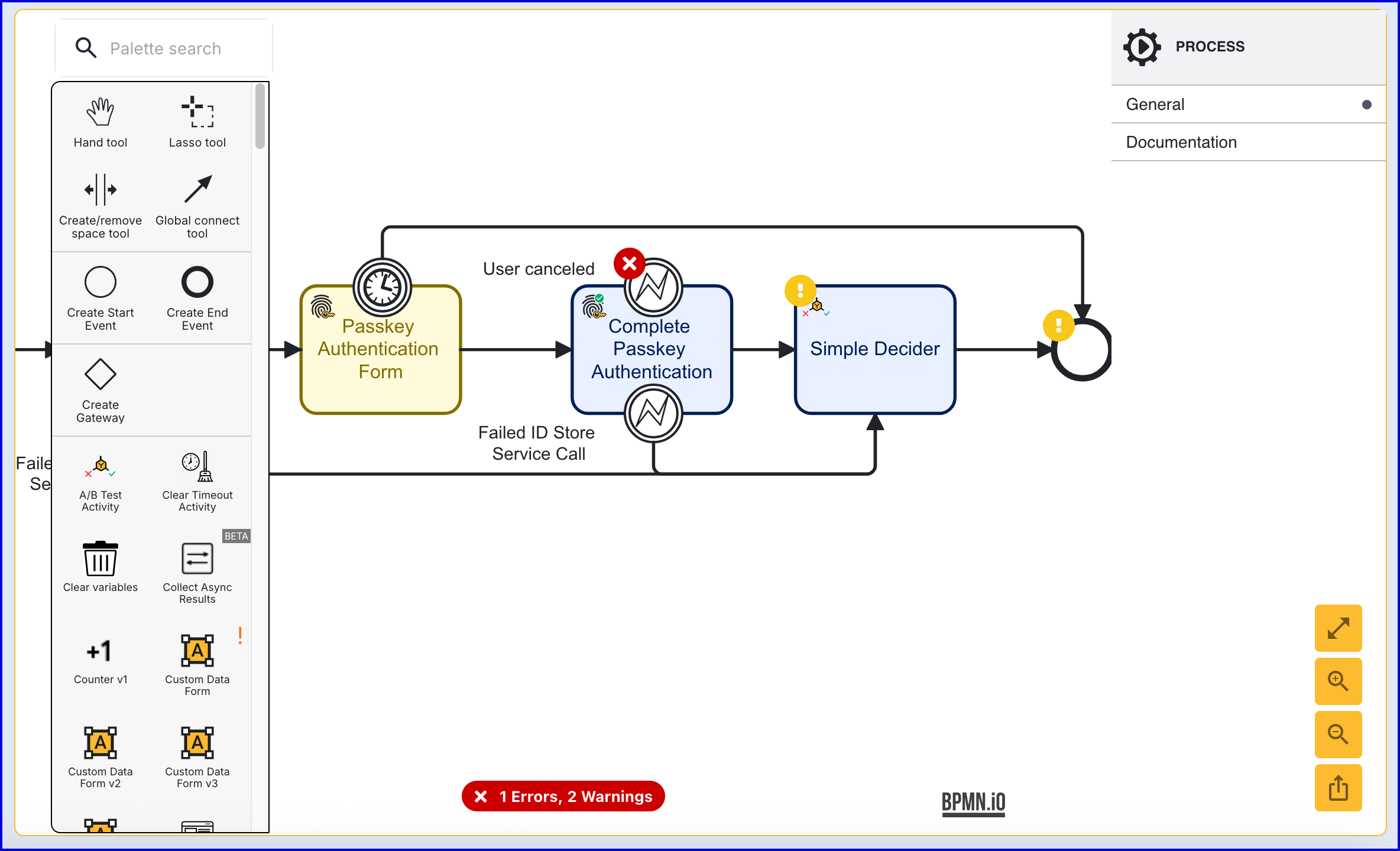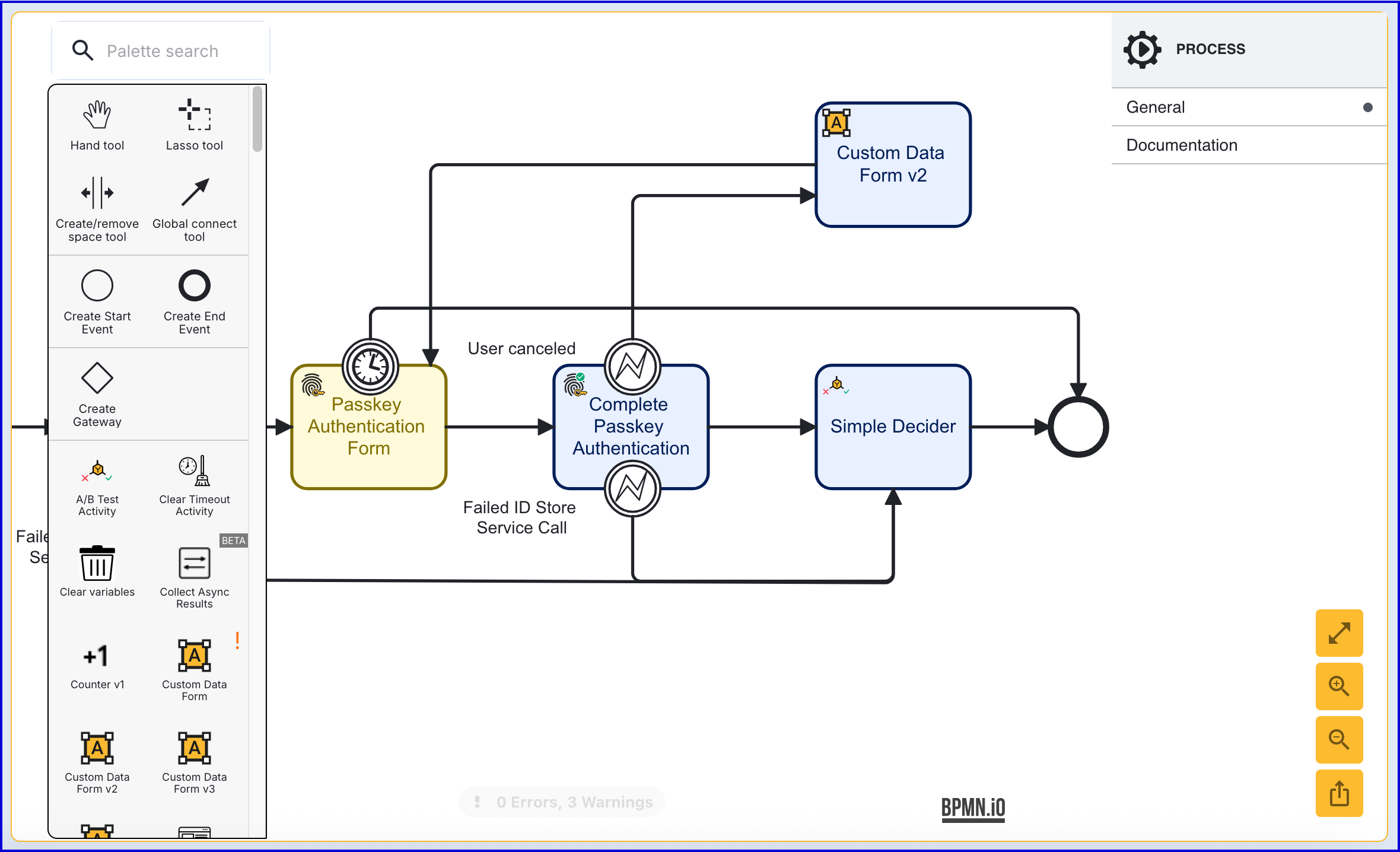 - In the Process Definition, add a 'Custom Data Form' activity and connect it to the 'User cancelled' boundary event using a sequence flow arrow. Connect another sequence flow arrow back to the 'Passkey Authentication Form' activity.