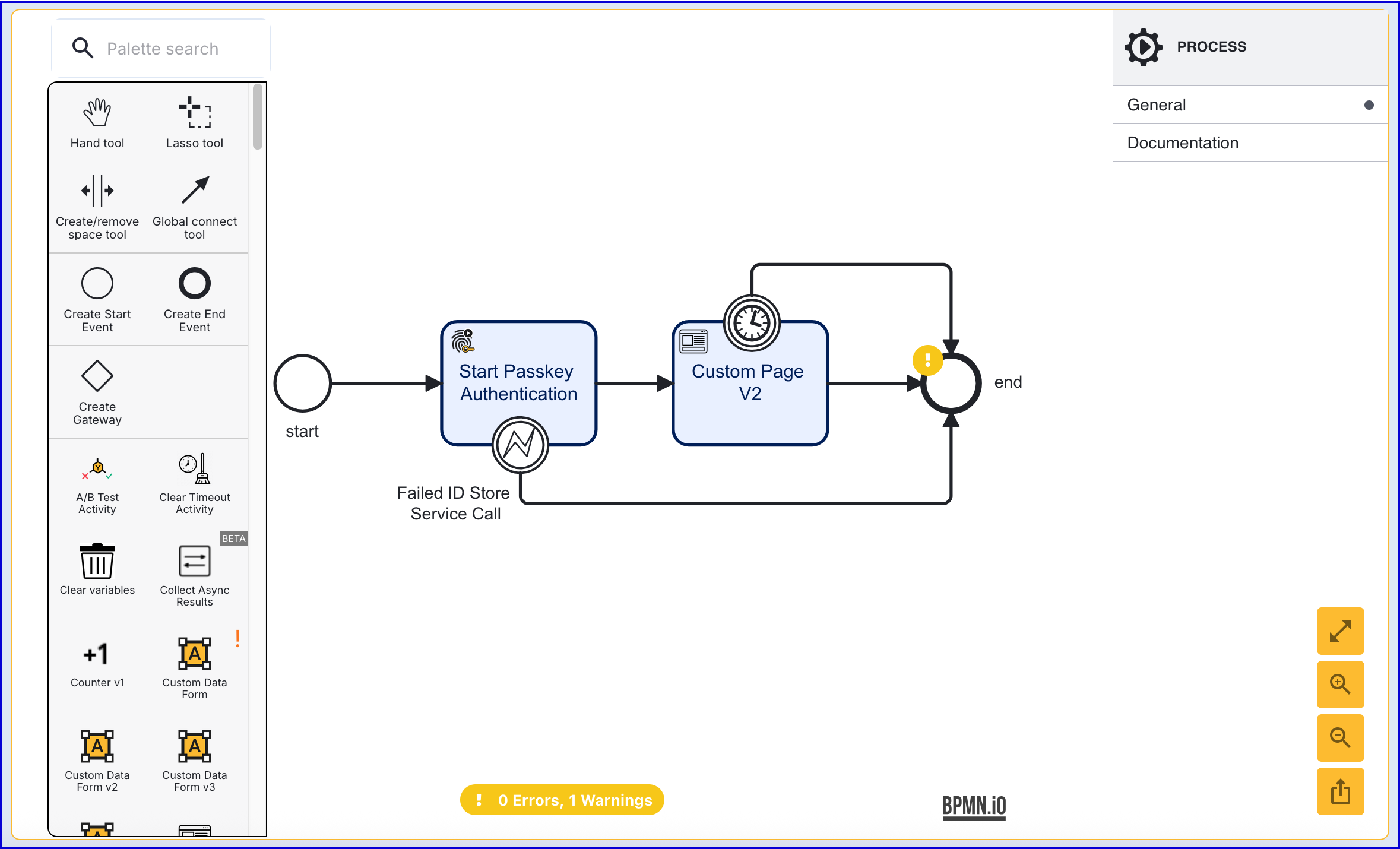 - In the Process Definition, configure the 'Custom Page V2' activity by connecting it to the 'Start Passkey Authentication' activity.