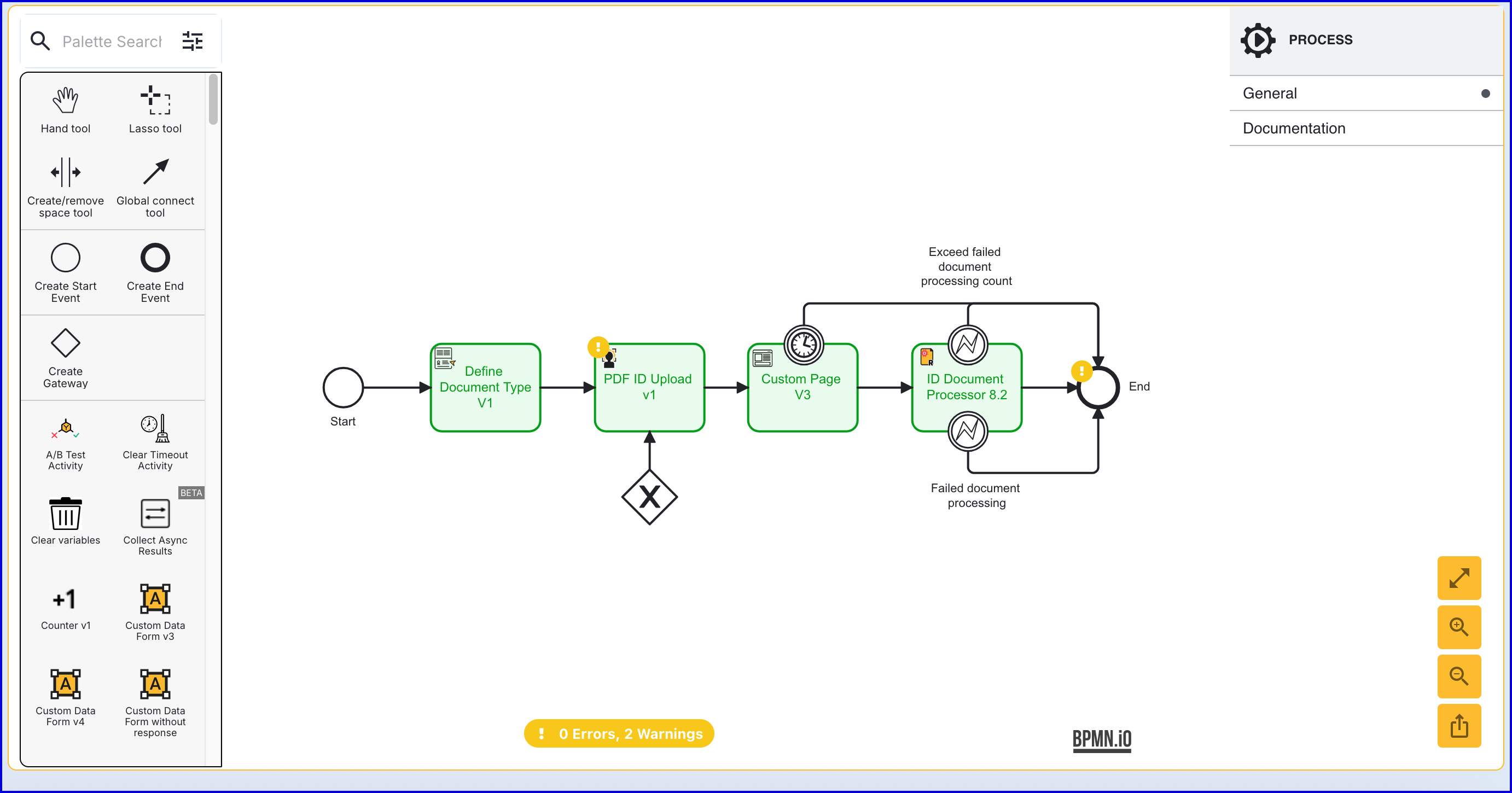 - Once configured, add a 'Create End Event' to the designer and connect the 'ID Document Processor 8.2' activity using a sequence flow arrow. This will conclude the