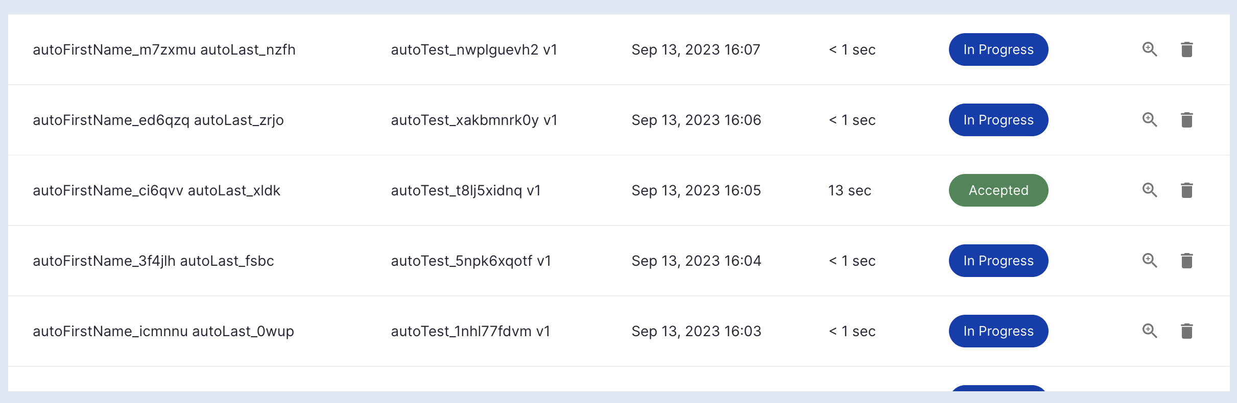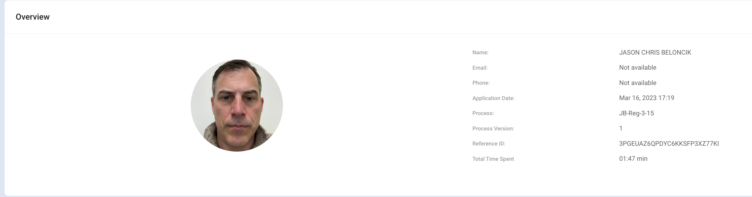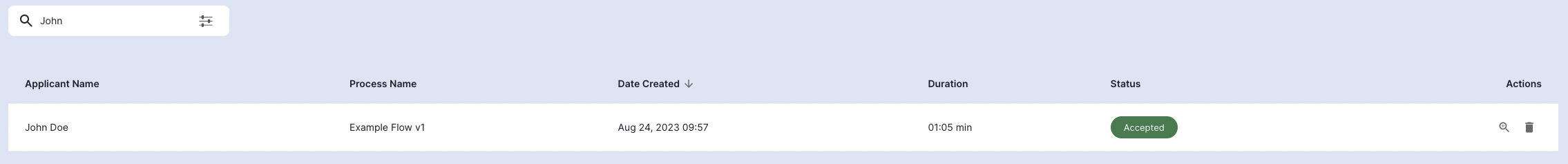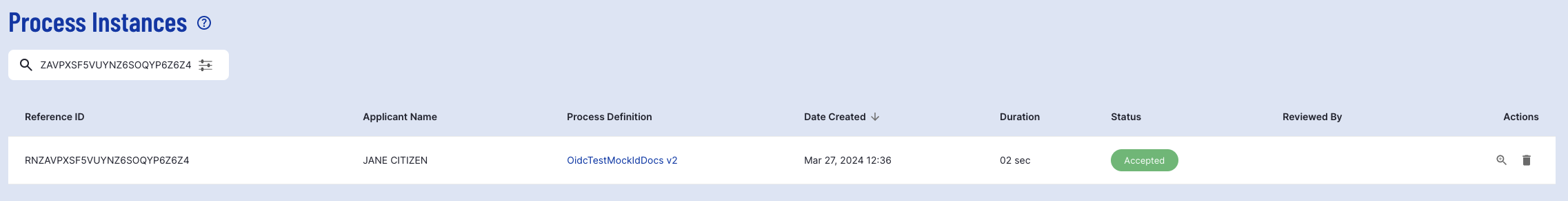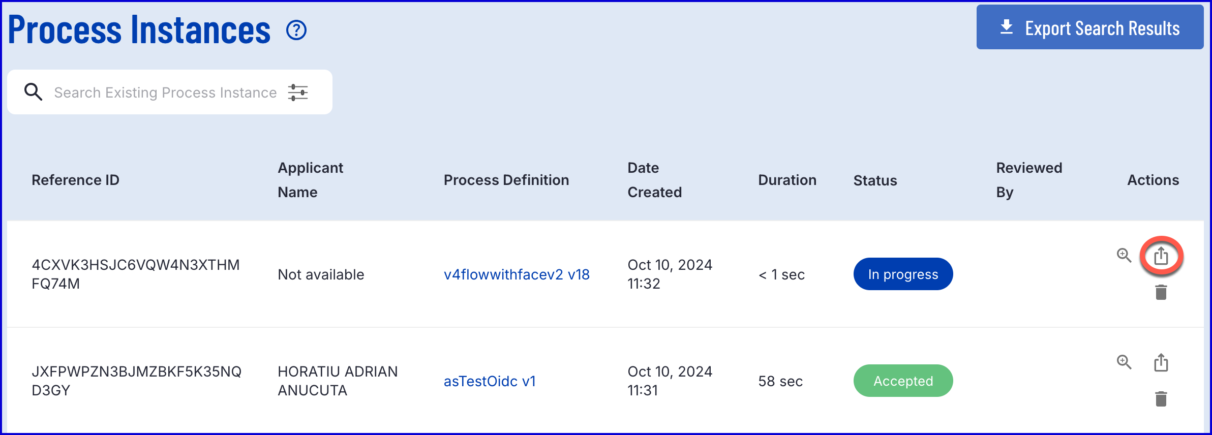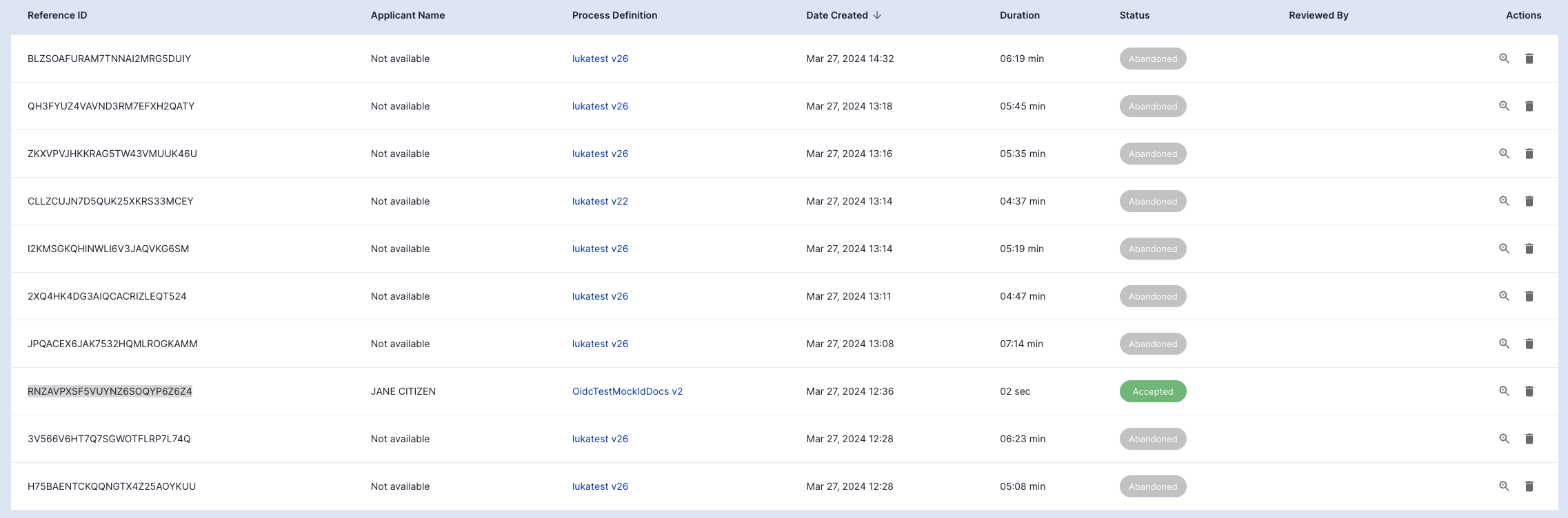 As mentioned in the Process Instances Detail section, information that is displayed in the search results table will depend on whether a successful document has been captured during the ID&V flow. When the Applicant Name is empty, 'Not available' will be returned. After a successful document capture, the information extracted from the document will populate this field only when the firstName
