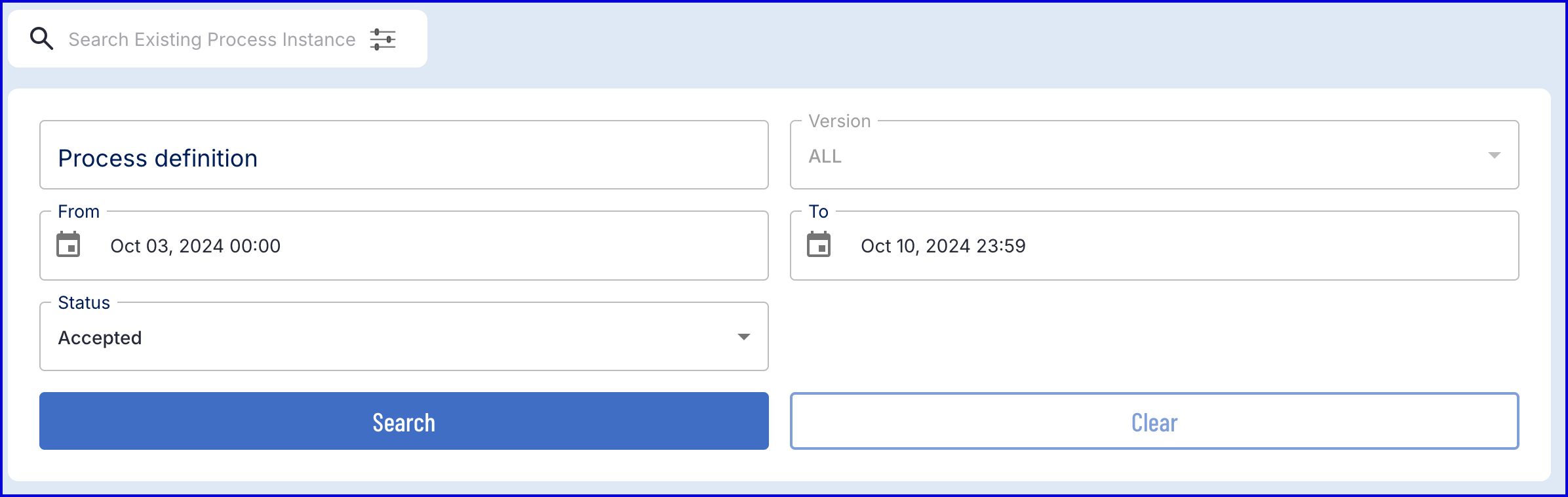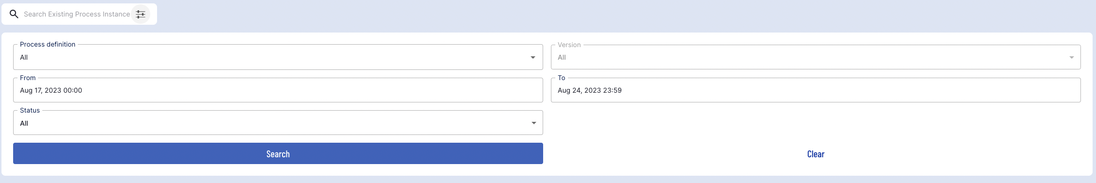 Process Instances can be filtered and searched on the Process Instance page by using the options available at the top-left of the page.