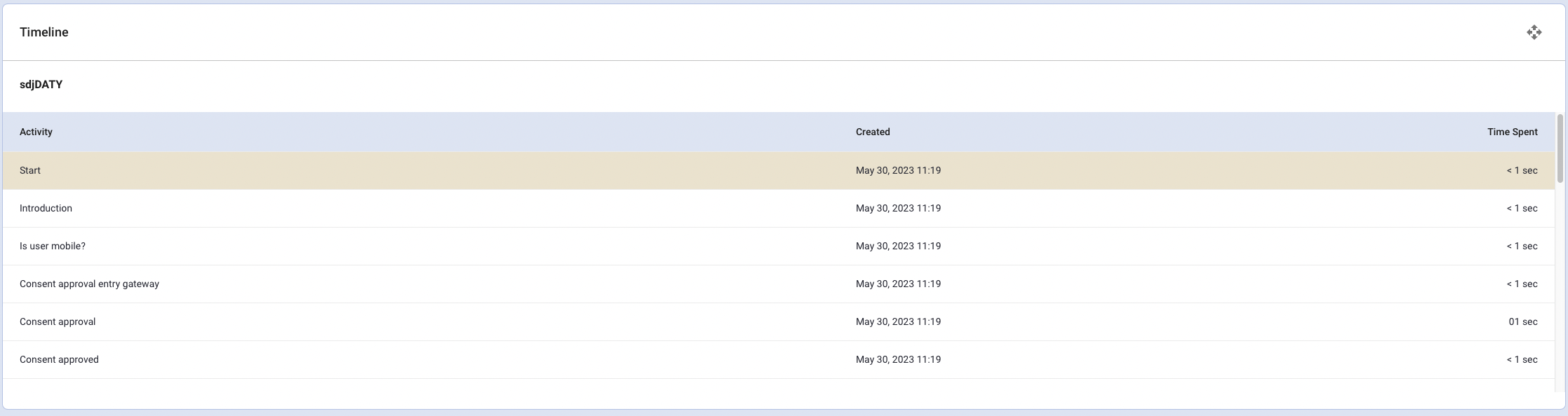 The timeline shows the activity the user undertook, when it was created and the time it took to do that particular activity.