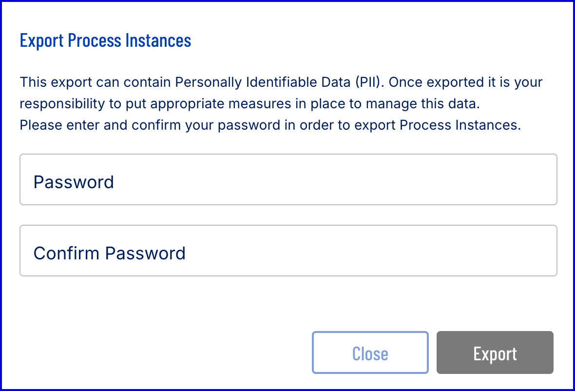 Process Instance data can be downloaded as a password protected zip folder containing a single or multiple Process Instances. Search filters applied on the Process Instance page will also be applied to the exported results.