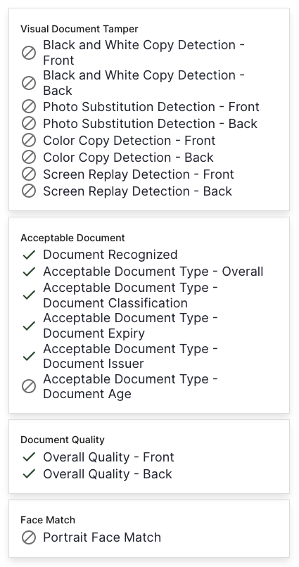 Summary Checks/Reports show all the different steps and check that the end user went through. Reports are available for face, documents and cloud functions during the Identity Verification flow. For example, the screenshot below provides a report of the results from a document Identity Verification flow.
