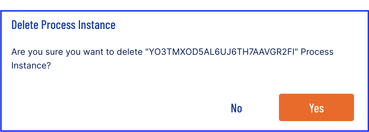 Clicking the 'Delete' button will open a pop-up modal to confirm the deletion. Selecting 'Ok' will remove the Process Instance from the system.