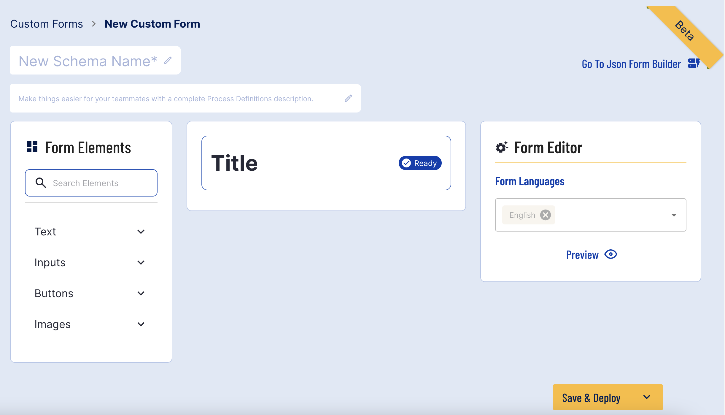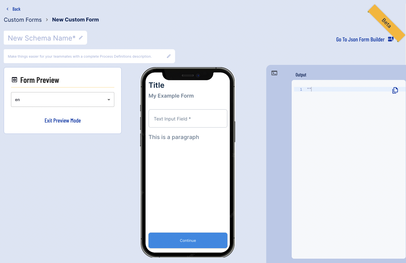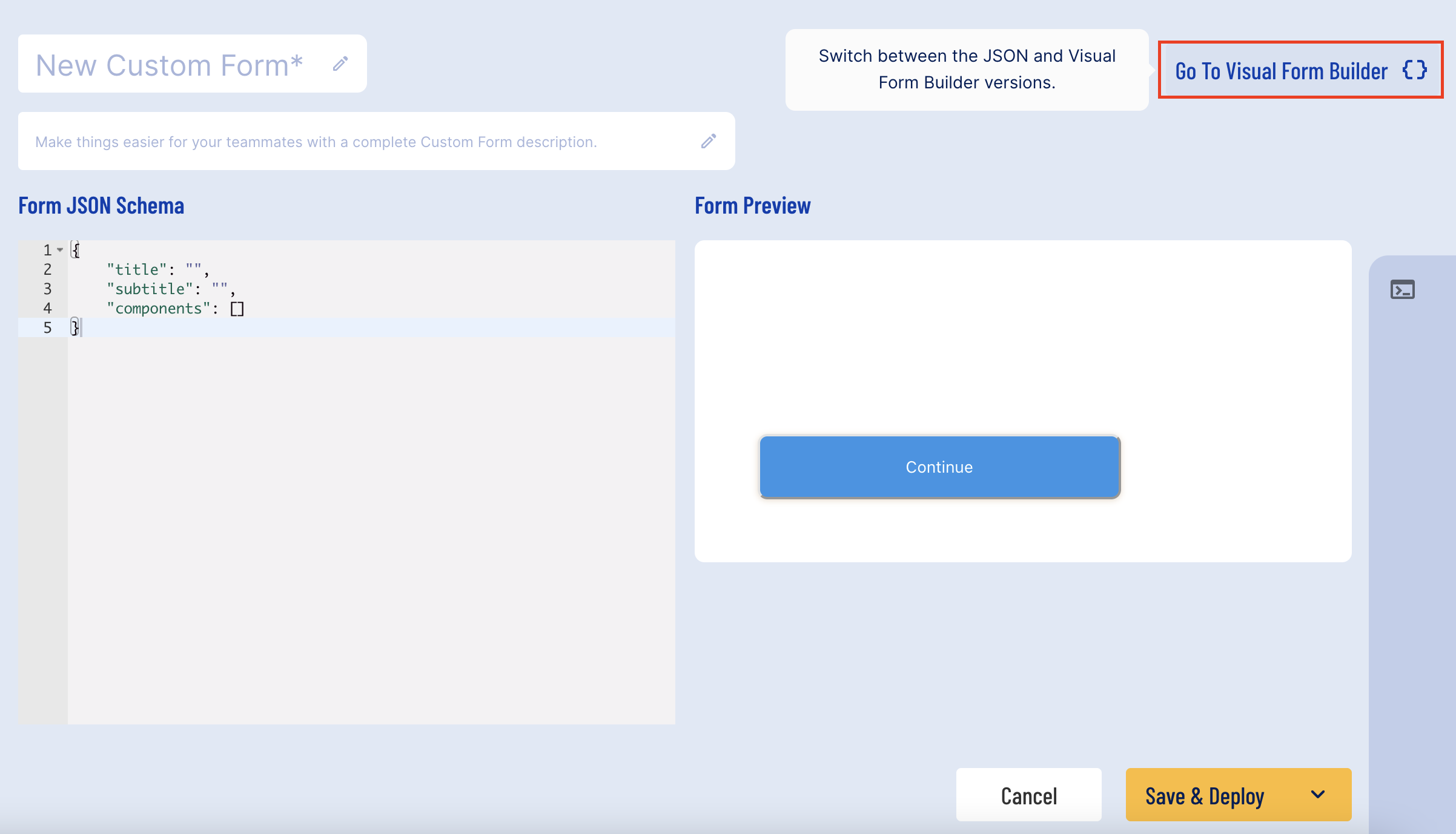 The Visual Form builder provides a flexible visual solution as an alternative to JSON schema for building Custom Forms.
