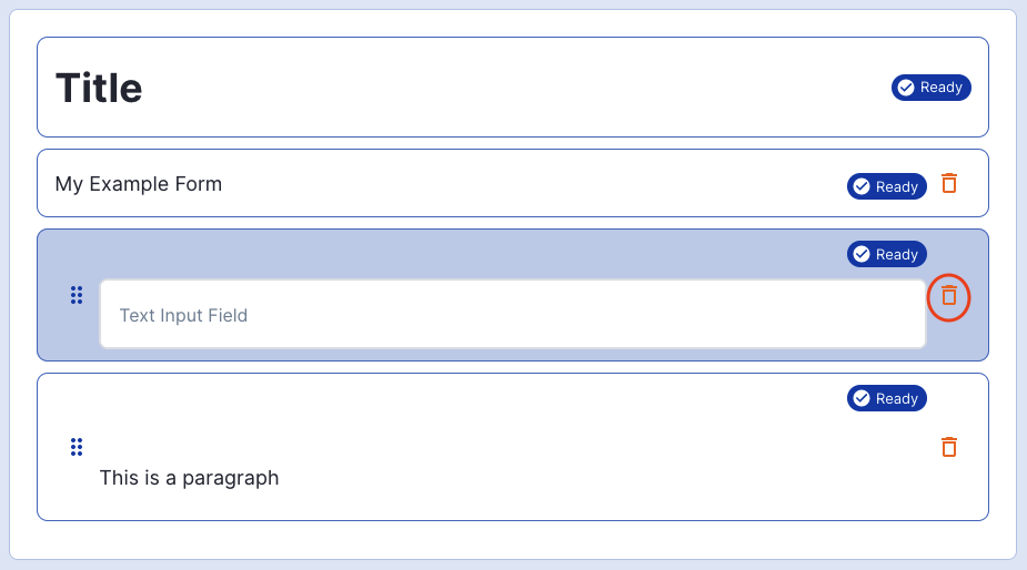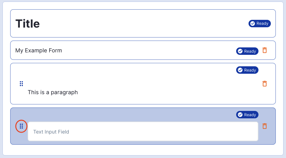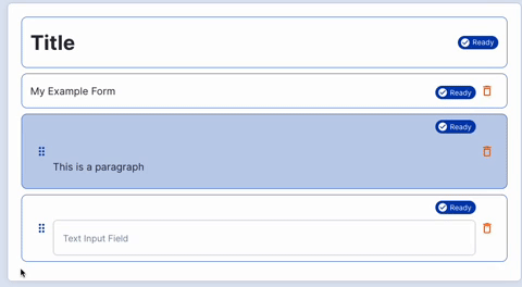In the example below, a paragraph and text input element have been added to the form. To the left of each element, a six-dot icon indicates that these elements can be rearranged.