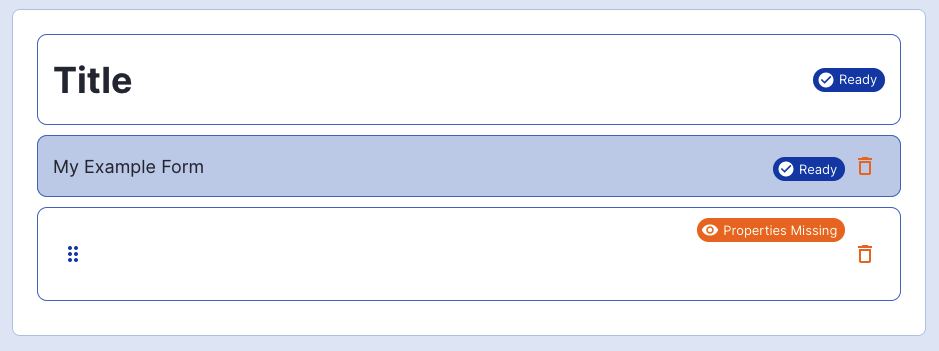 The properties of some form elements must be configured before the form can be successfully implemented. In cases such as this, the status that appears next to the form element will indicate further configuration is required.