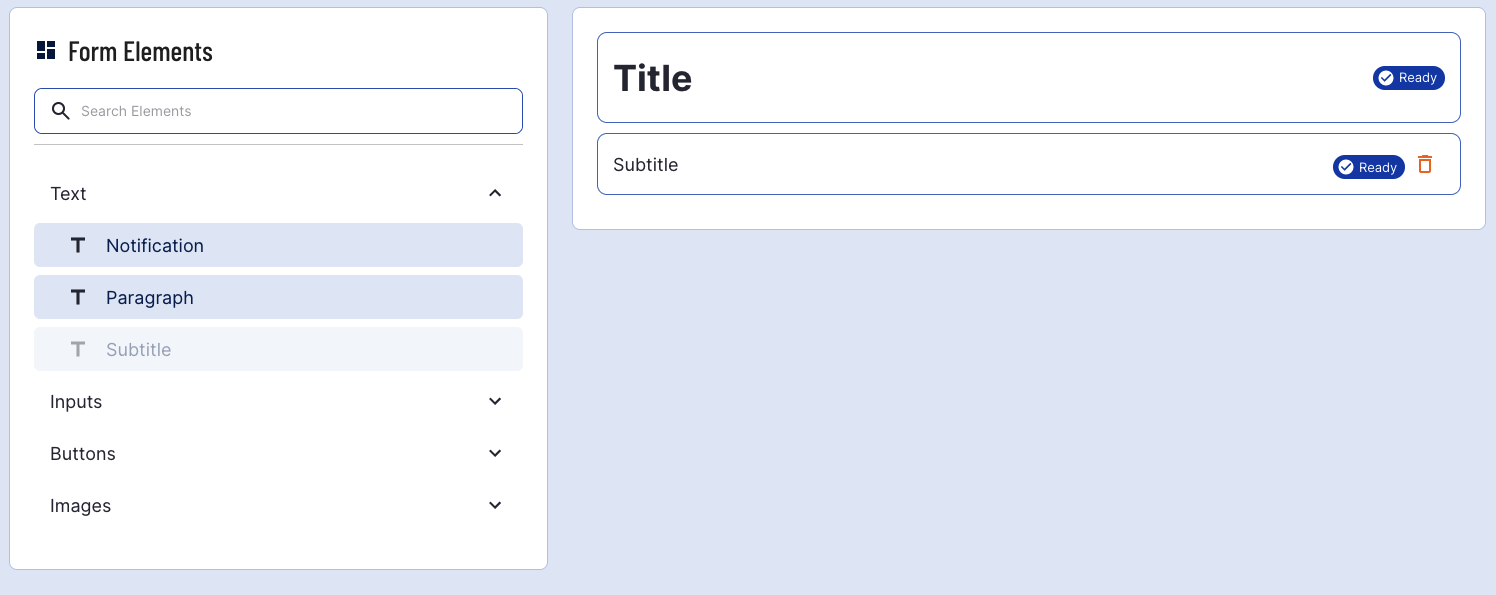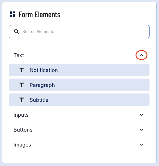 Form elements allow users to add various text fields, inputs, buttons, and images to fill out the details of their form. This section will describe how to build a form using the input fields available, define properties, and edit the placement of these form elements.