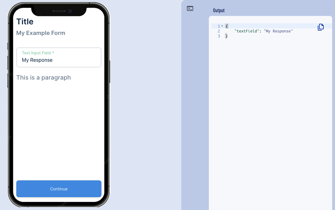Any input fields provided in the form can be tested by using the mobile demo provided. In this example, a response will be entered in the text field. Afterwards, the 'Continue' button is pressed where the output will be provided in the panel on the right of the screen.