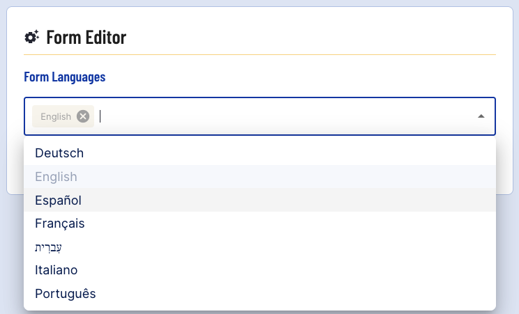 Form languages can be defined from the form editor on the right of the screen. By default, English is the only form language selected. Additional languages can be added by clicking the drop-down list and selecting an additional language.
